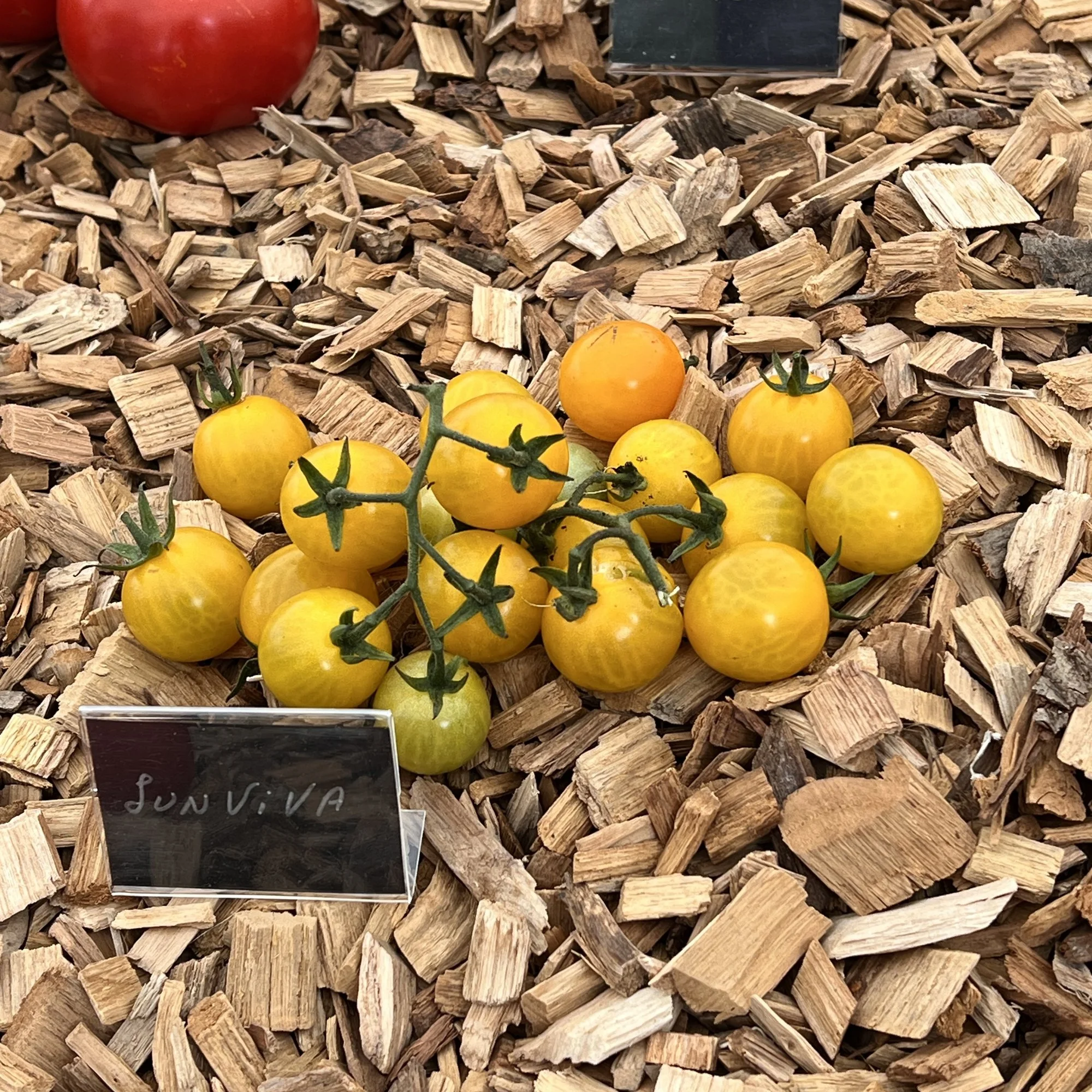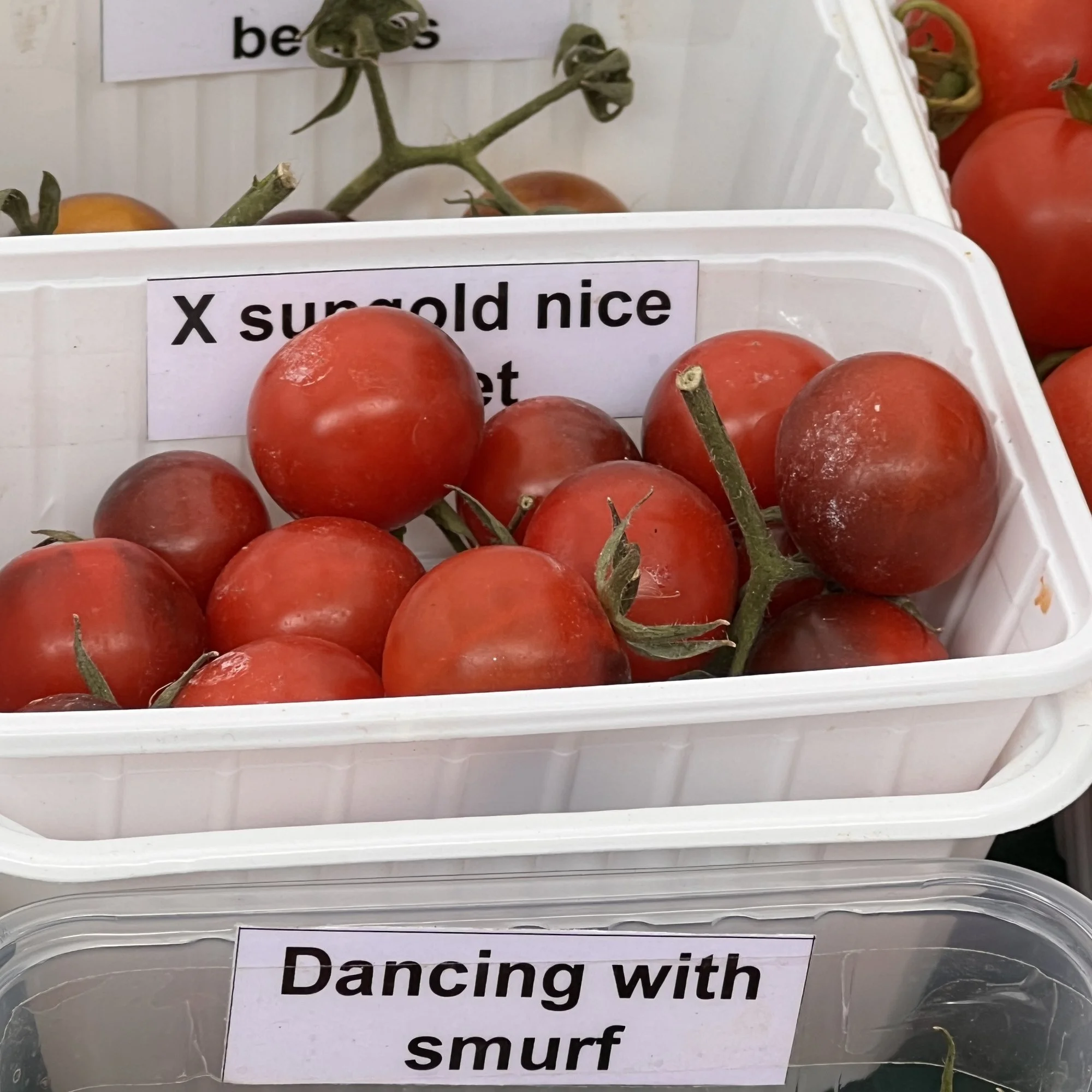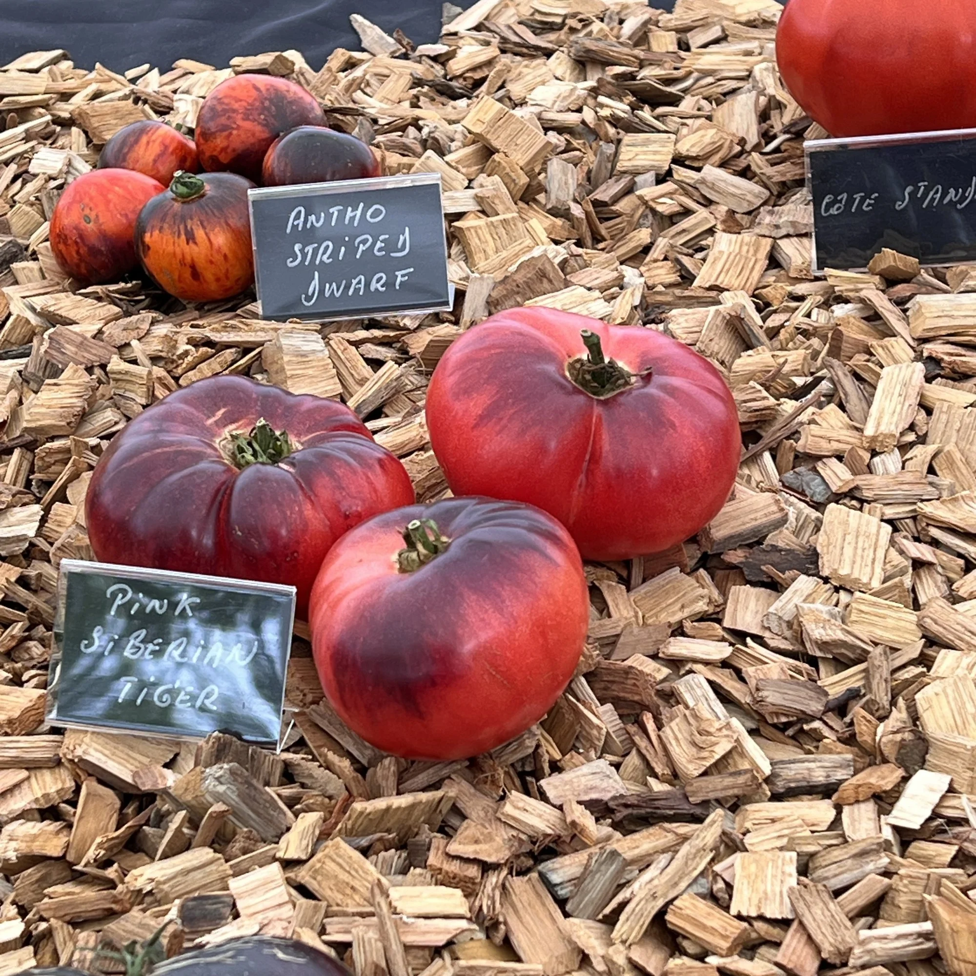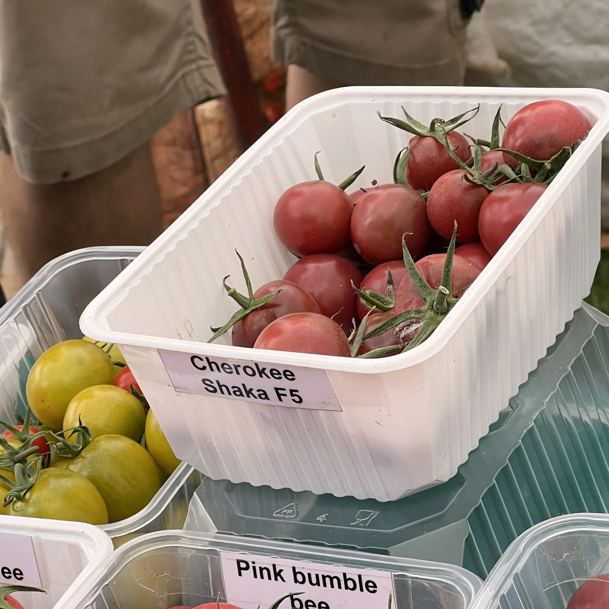 Dieses Jahr hatte ich eine ganze Bäckerkiste voll Tomaten mit. Fein sortiert nach Sorten.