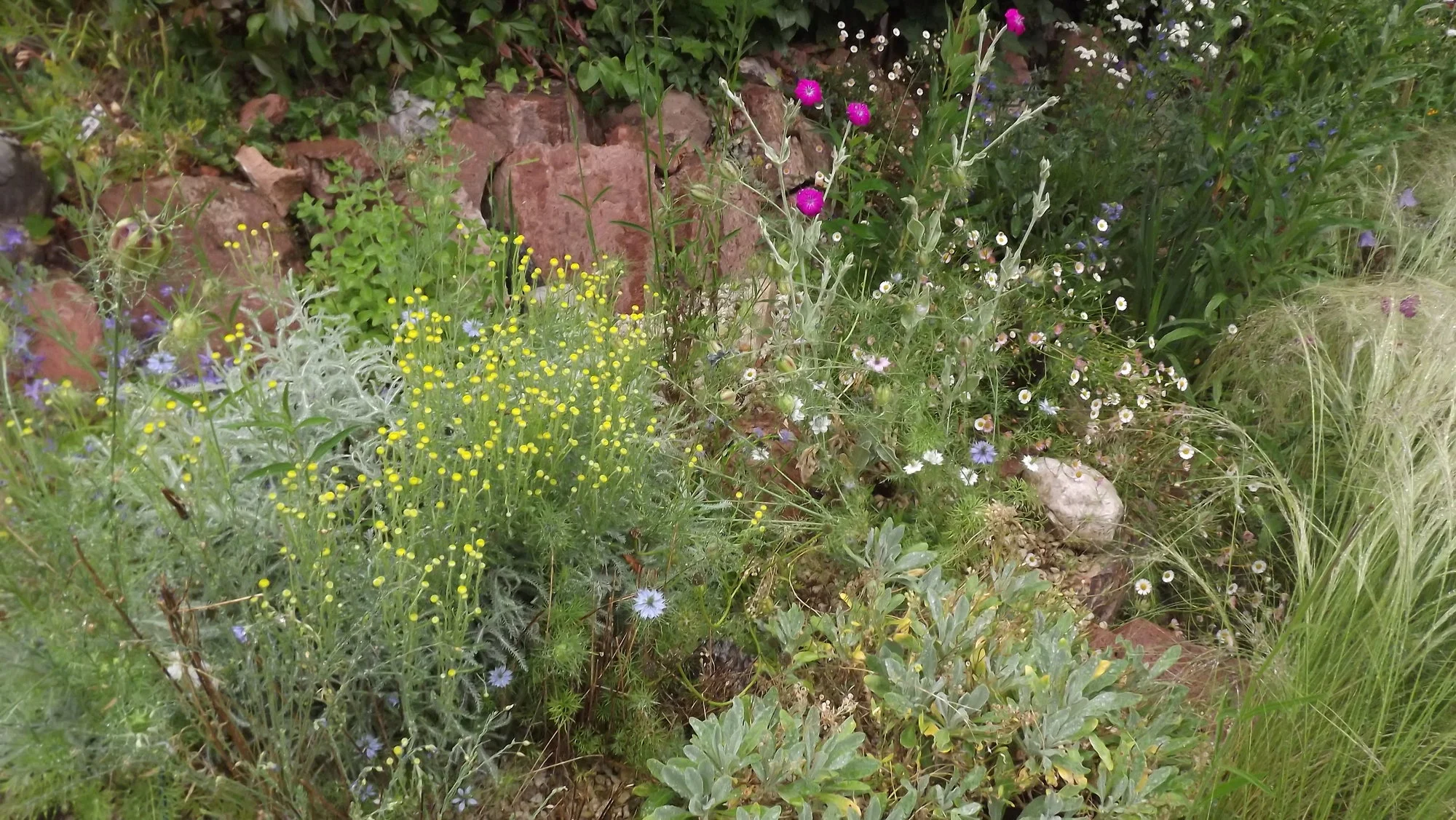 Es ist eigentlich auch guter lehmiger Gartenboden, war aber über die Jahre völlig vergierscht, daher musste ich den Boden so tief abgraben, um alle Wurzeln zu entfernen. Der Gartenteil liegt nach Südwesten und den ganzen Tag knallt die Sonne drauf, also habe ich aus der Not eine Tugend gemacht. Ich habe einen Hanggarten, daher wurden auf die Schräge Natursteinmauern neu aufgebaut, die alten sind mit den Jahren eingefallen. Die Mauern wurden im Winter 2017/2018 gebaut, im Frühjahr 2018 habe ich den Boden hinter den neuen Mauern abgegraben und dann wie o.g. genannt neu aufgefüllt und bepflanzt. Inzwischen haben sich Johanniskraut, Mutterkraut, Bergflockenblume, Akelei, Pfirsischblättrige Glockenblume, Habichtkraut u.a. von selbst dort eingefunden und fühlen sich so wohl, dass ich an manchen Stellen eingreifen und etwas zurücknehmen muss. Die Samen von Jungfer im Grünen und Kalifornischem Mohn habe ich im ersten Jahr direkt auf den Kies gestreut, wo sie gut gekeimt sind und sich durch Selbstaussaat jedes Jahr wieder einfinden.