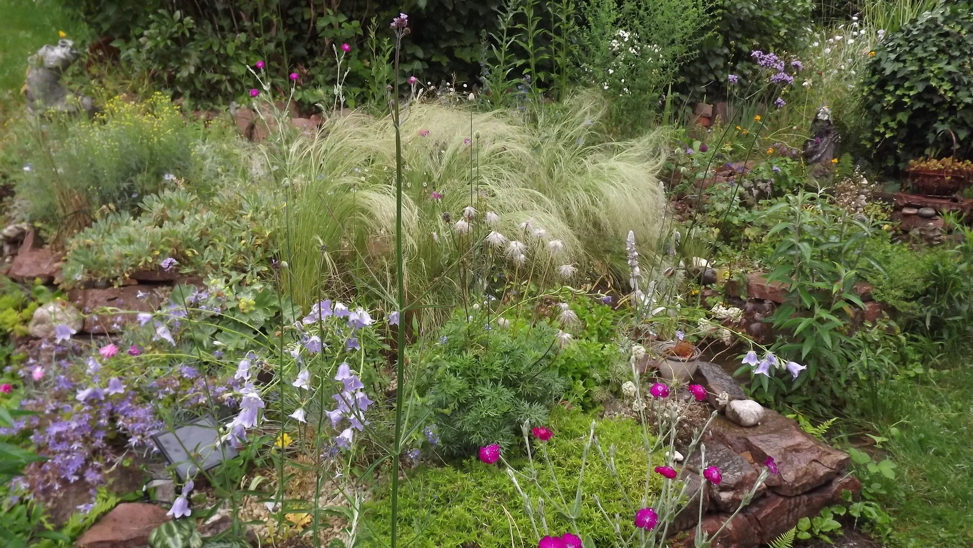 Vor ungefähr 10 Jahren stieß ich dann auf Beth Chattos Kiesgartenbuch und legte dort unseren Kiesgarten an und der Erfolg trat endlich ein: ein blühendes (aber sicher nicht pflegeleichtes) Paradies.