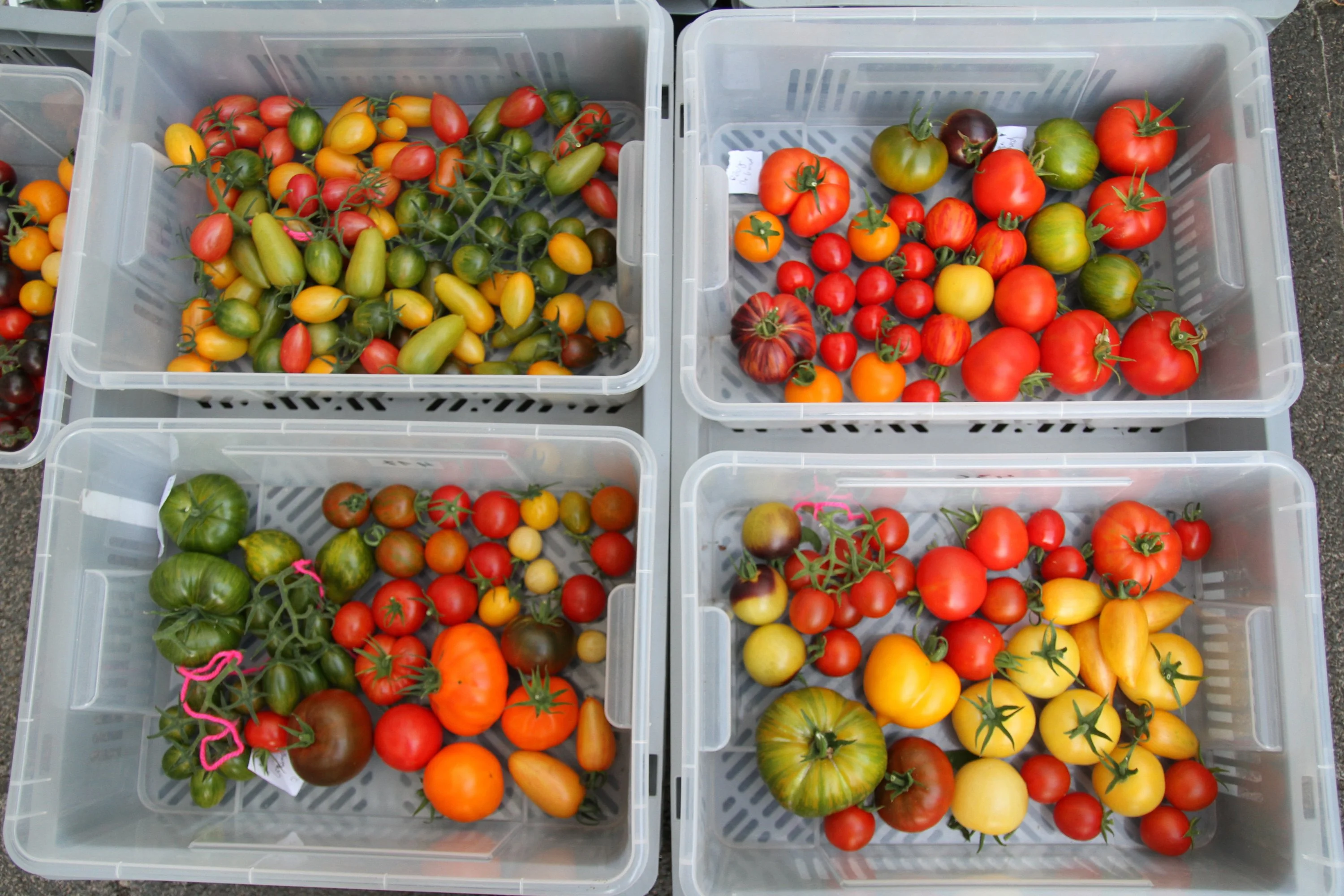 Im Gewächshaus sind Costoluto Genovese, Ochsenherz, Monterosa (F2?), Zuckertraube, Black Cherry, Splash of Cream, Giraffe, Artisan Pink Bumblebee, Lutescent, Idyll, White Sensation und Green Zebra.