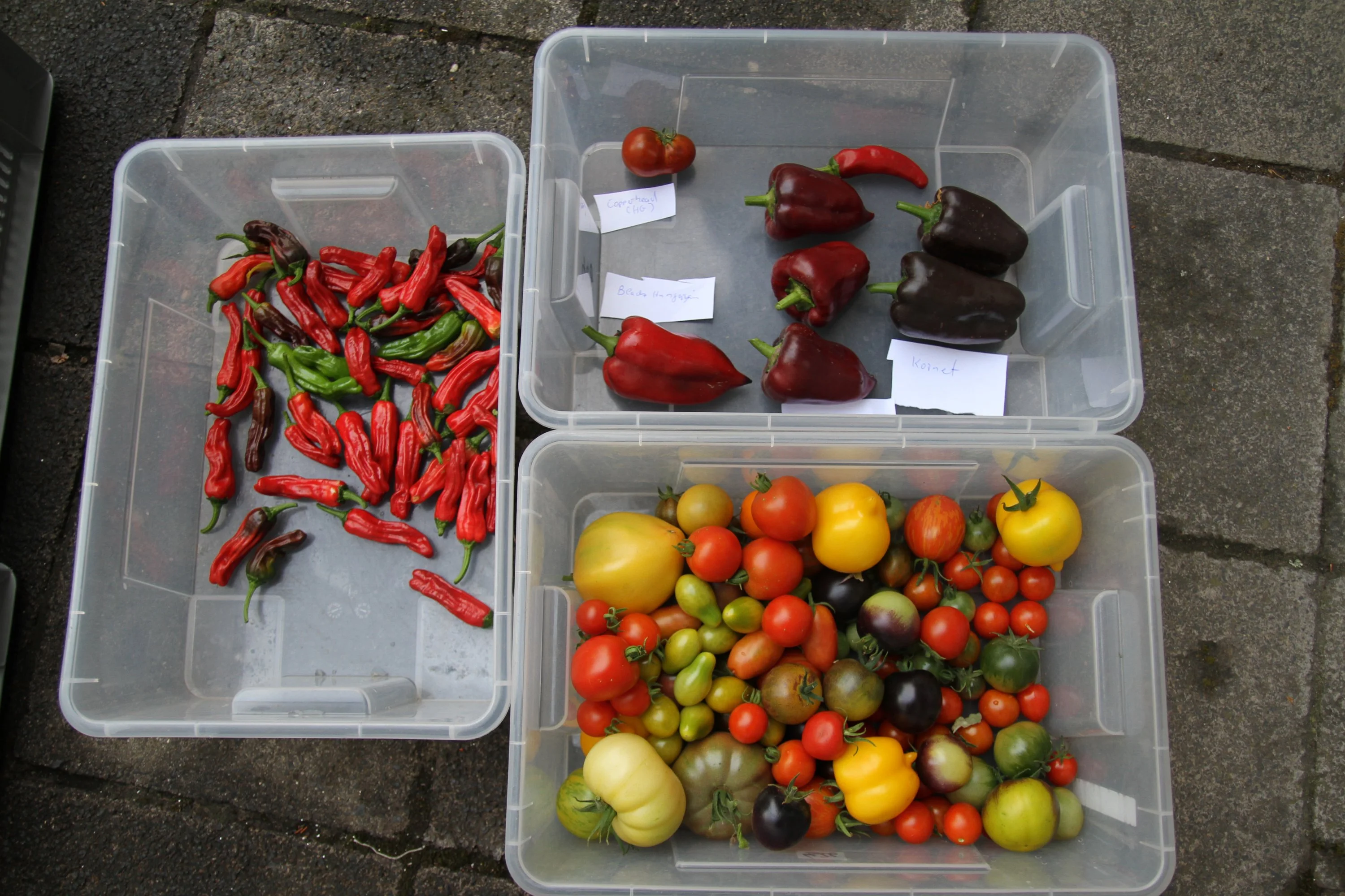 Ein paar Paprika sind auch dabei. Sie sind links unten im Kistchen mit den kleinen gelben Tomaten. Alle anderen sind Chilis.