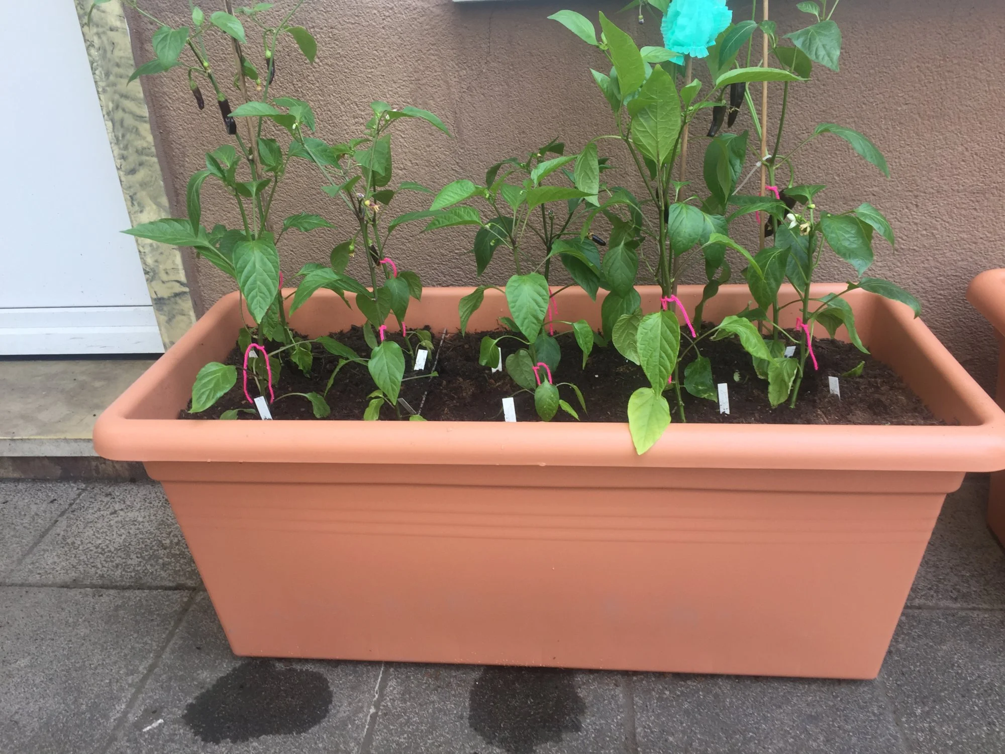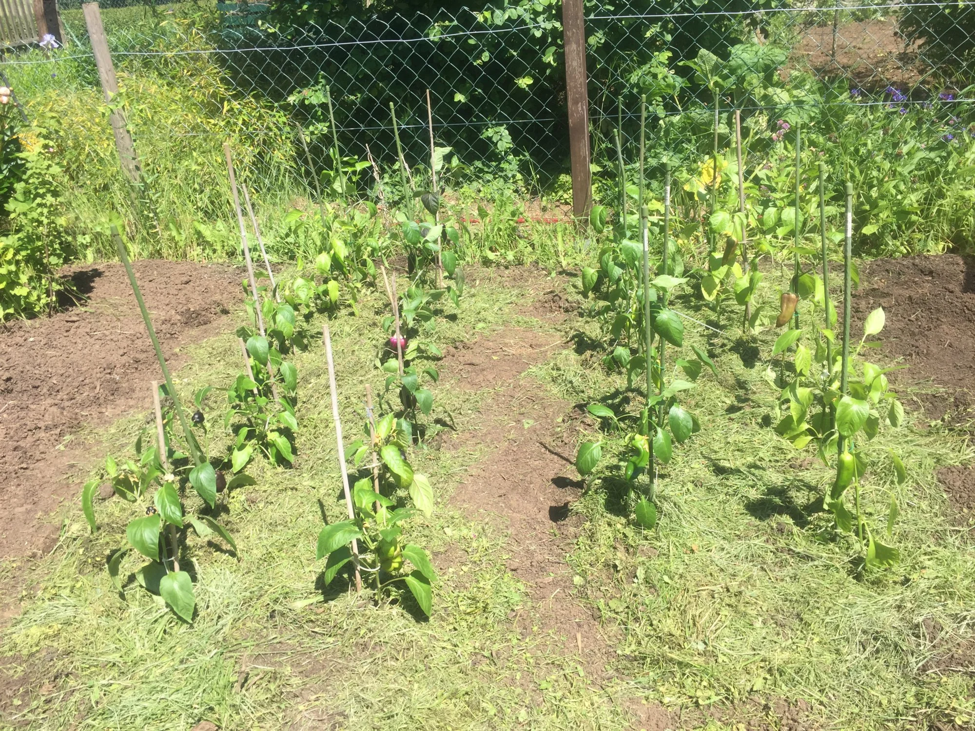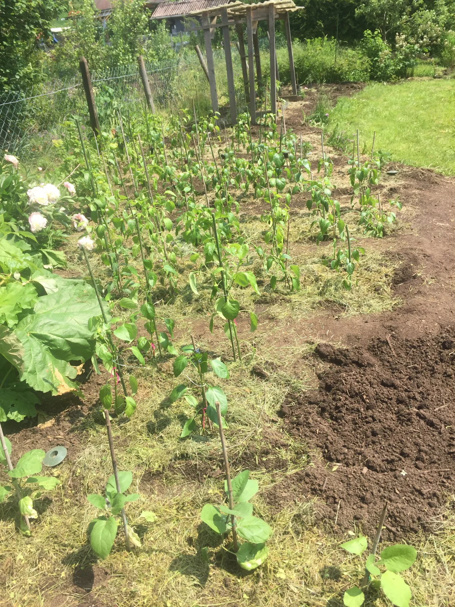 Bevor die Mittagshitze kam, habe ich ab 8.00 Uhr weitere 25 Paprika und die ersten Chilis in den Pachtgarten gesetzt. Dazu ein paar Tagetes und Bergminze.
