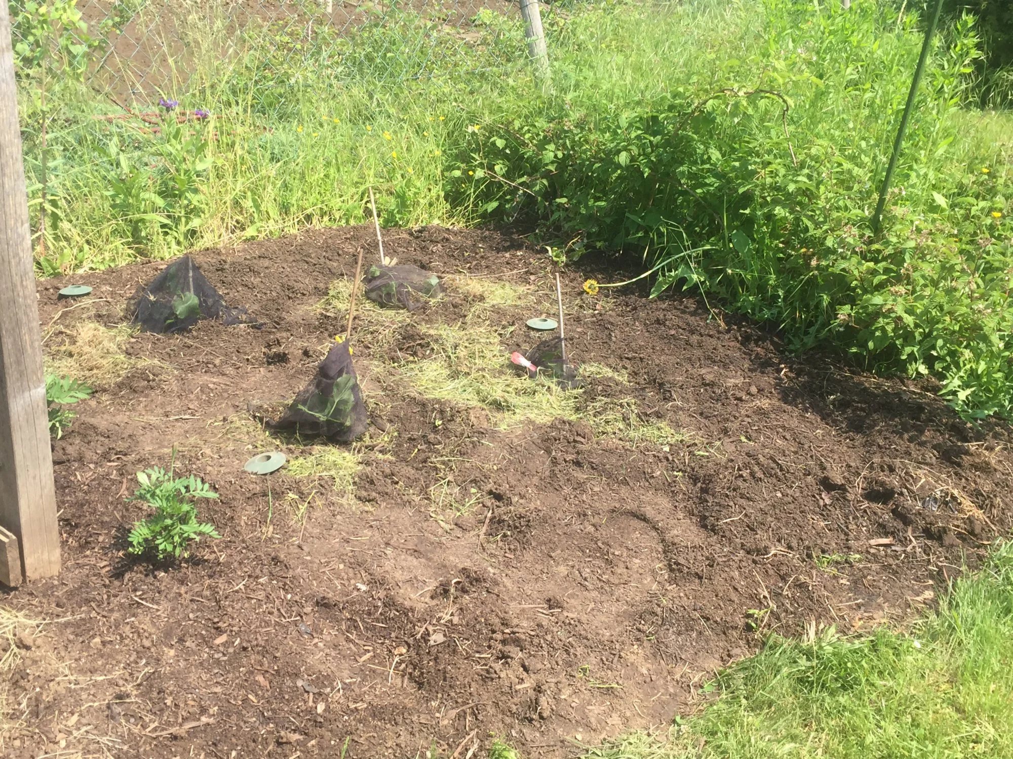 Erste Reihe Auberginen. Der freie Platz ist für Kürbis.