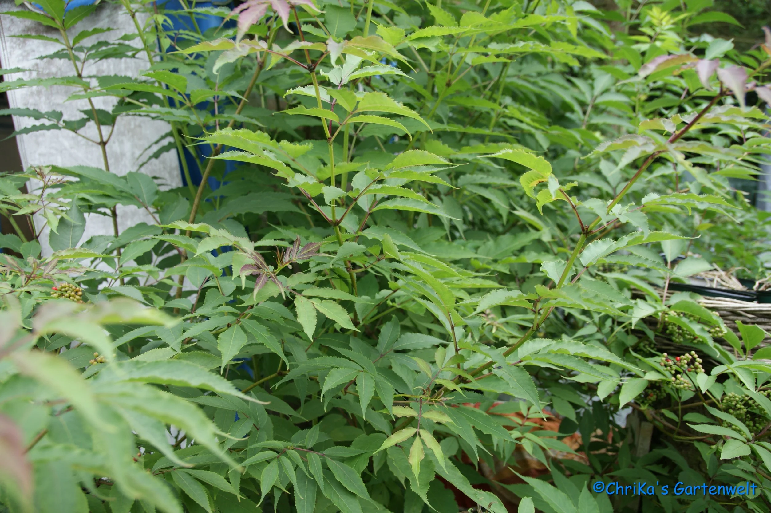 Sieht aus wie Holunder. Der wächst bei mir wie ein Bodendecker x 1000% schneller. Der hat ein Netz wurzeln Das muss ich immer wieder rausziehen damit mein Staudenbeet nicht davon voll wird.