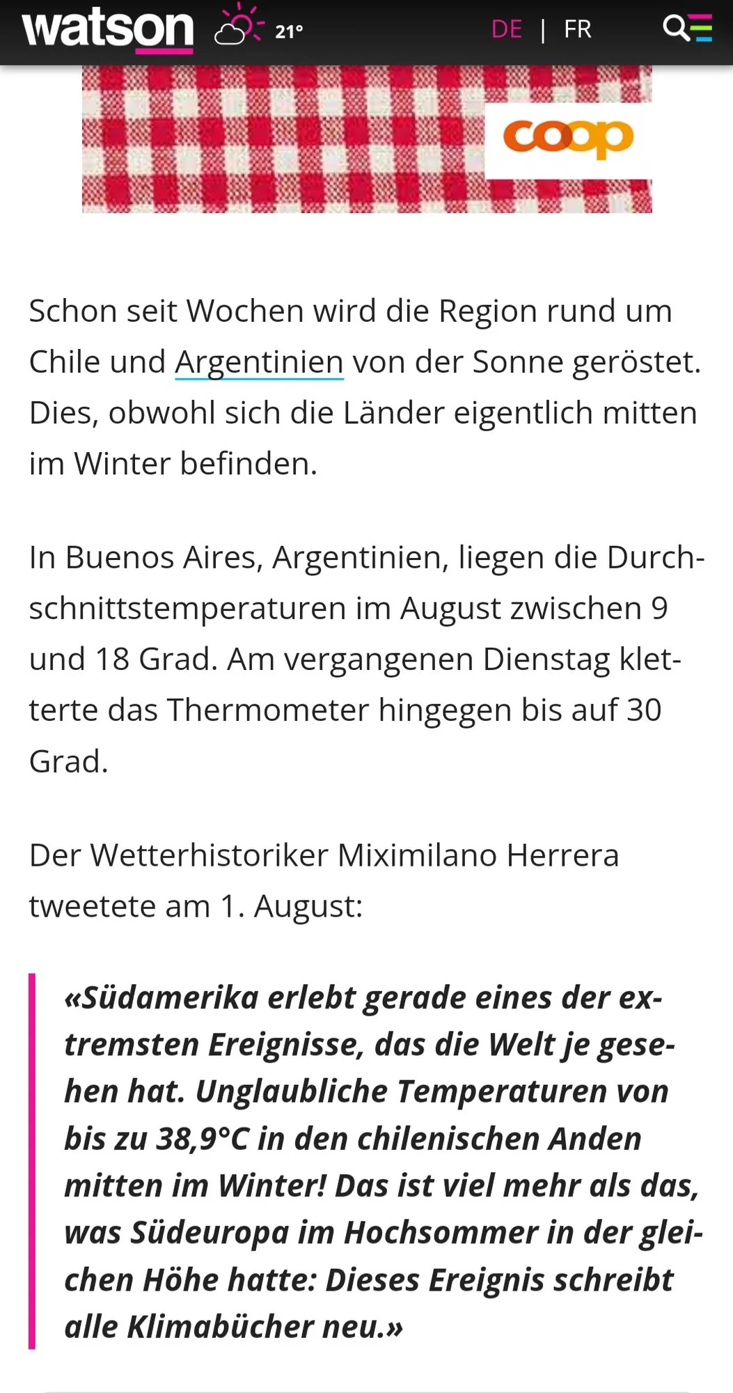 Das wäre wirklich interessant. Wenn jemand was meldet, kann man leider nicht nachschauen, ob es wahr ist. Wettervorhersagen gibt es reihenweise, aber Rückblicke nicht. Wobei zu bedenken ist, dass Buenos Aires in der subtropischen Klimazone liegt, also Winter dort heißt 7 - 15 °C.Wir haben einen Bekannten in Buenos Aires. Meine Mutter könnte ihn mal fragen was da stimmte und wie das Wetter wirklich war. Mal schauen, sollte sie ihn fragen berichte ich gerne.