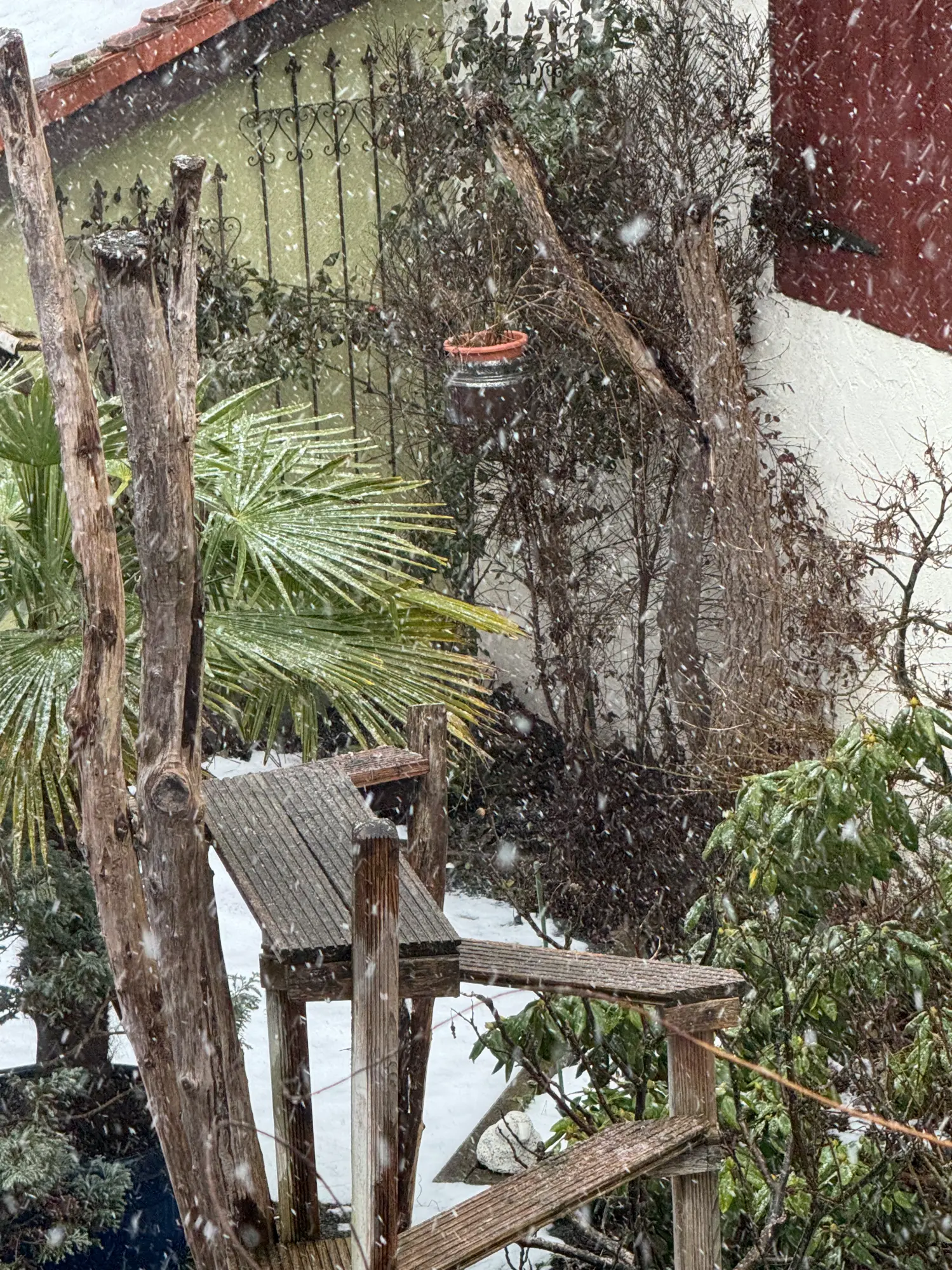 Jetzt schneits hier auch. Da aber erst ein weisses Schäumchen liegt kann das bei der momentanen Intensität noch nicht sehr lange der Fall sein. Vielleicht ist doch gut muss ich schon um kurz nach 7 auf dem Bus sein, besser werden die Strassen wohl heute nicht mehr