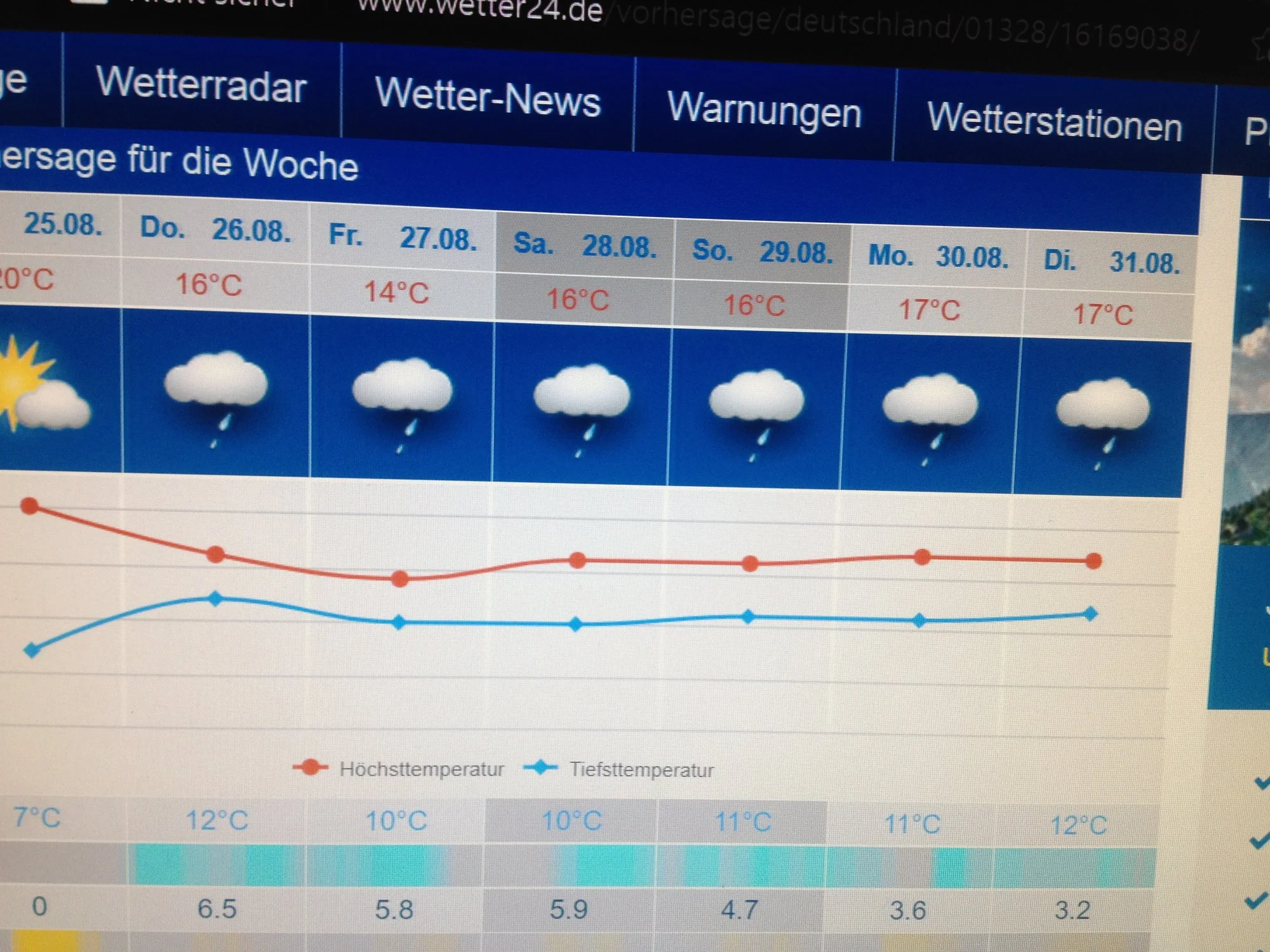 Unseres ist auch nicht viel besser. Die nächsten sechs Tage Regen. Vielleicht 1-2 Grad wärmer. Meinen Urlaub habe ich mir irgend wie anders vorgestellt.Ich auch nicht, wir haben dieselbe Vorhersage.![]()