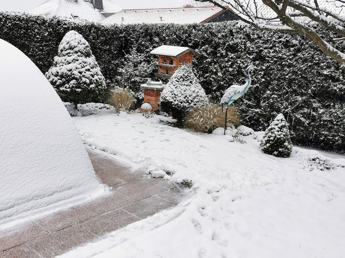 Wir haben heute auch das 1. mal Schnee räumen müssen, aber im Garten gefällt uns die weiße Pracht...