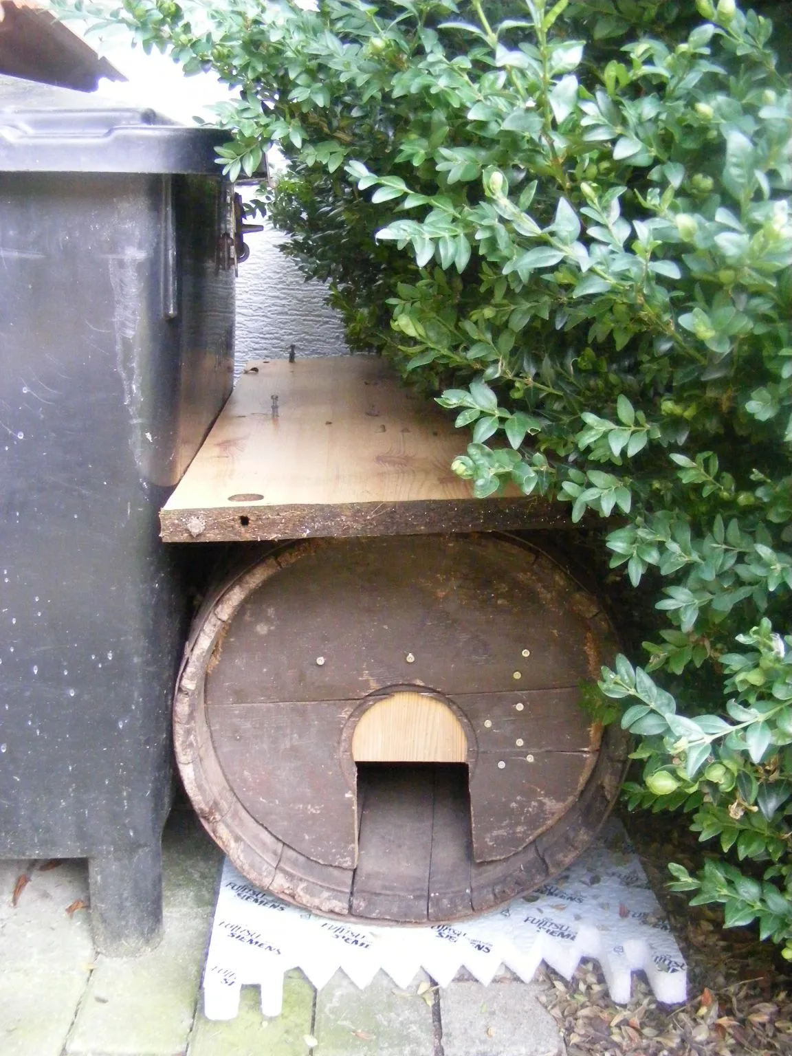 Die Igelfutterstelle habe ich so eingerichtet, daß sie nicht von Katzen geplündert werden kann. Hier gibt es in der Nachbarschaft viele Katzen, die sonst alles wegfuttern würden.
