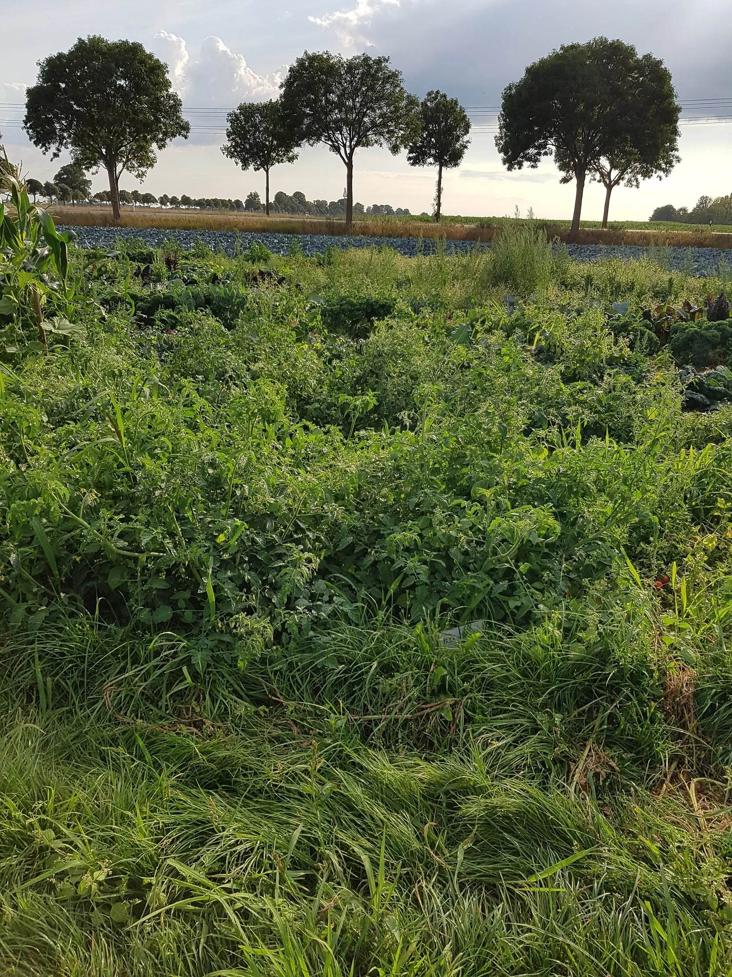 Die sehen schon sehr gut aus. Bin gespannt, wie es mit denen weitergeht. Vielleicht hatte das hier auch so funktioniert. Aber ich stelle mir das Ernten sehr unangenehm vor! Hast Du grübe abreifende Sorten auf dem Acker? Hast Du eigentlich gemulcht oder liegen sie auf der Erde?Vorne sind die Tomaten.