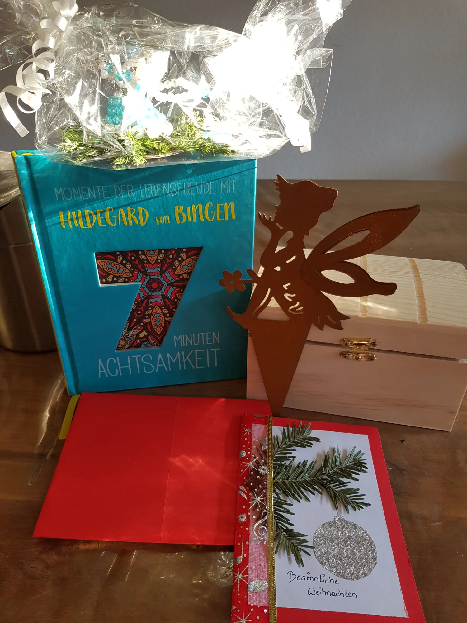 Neben der schönen Topfelfe und einem Perlenengel, habe ich ein Achtsamkeitsbuch bekommen und zwei Karten. Eine zu meinem Geburtstag und zum Fest gab es auch eine liebe handgemachte.