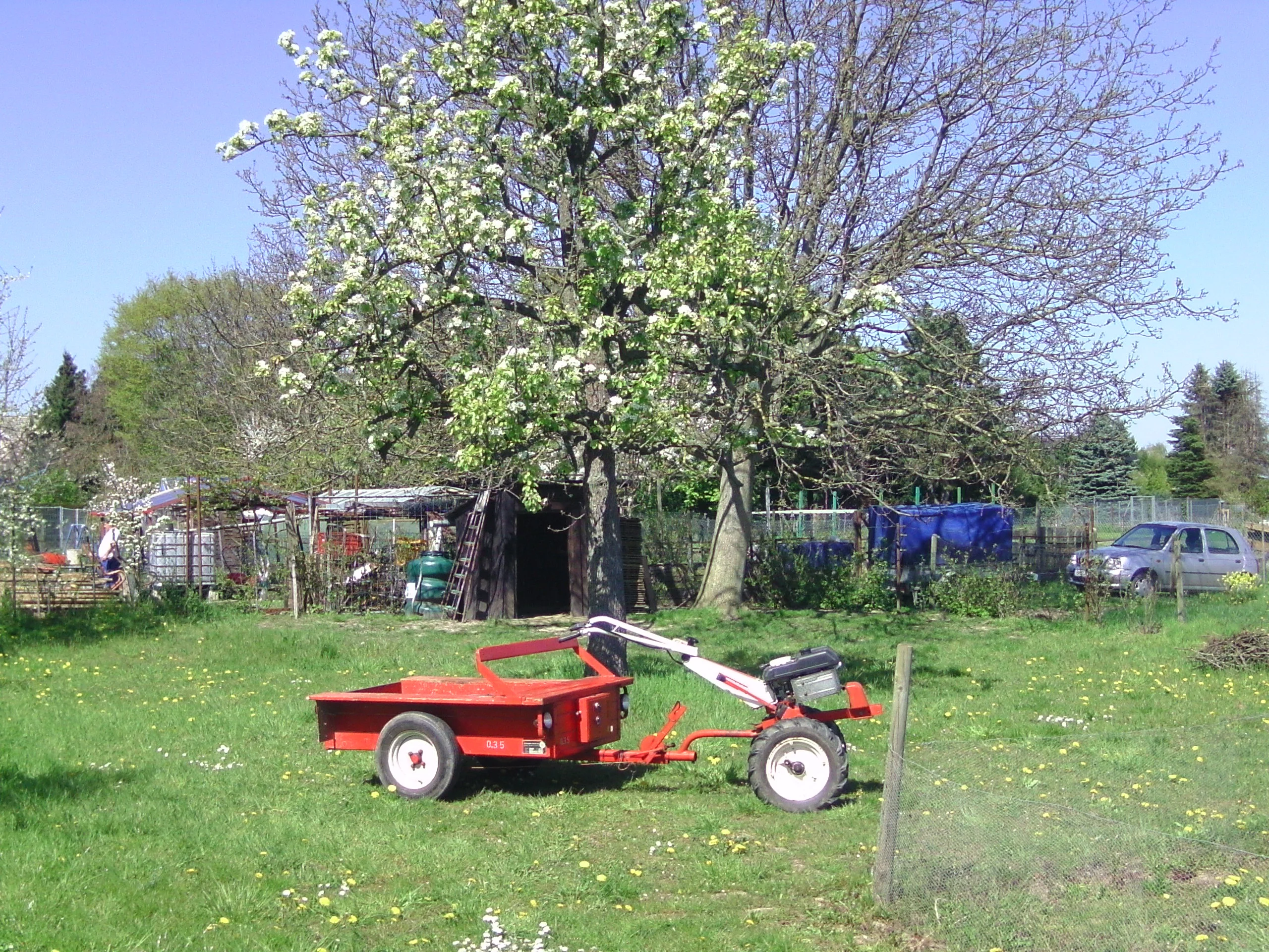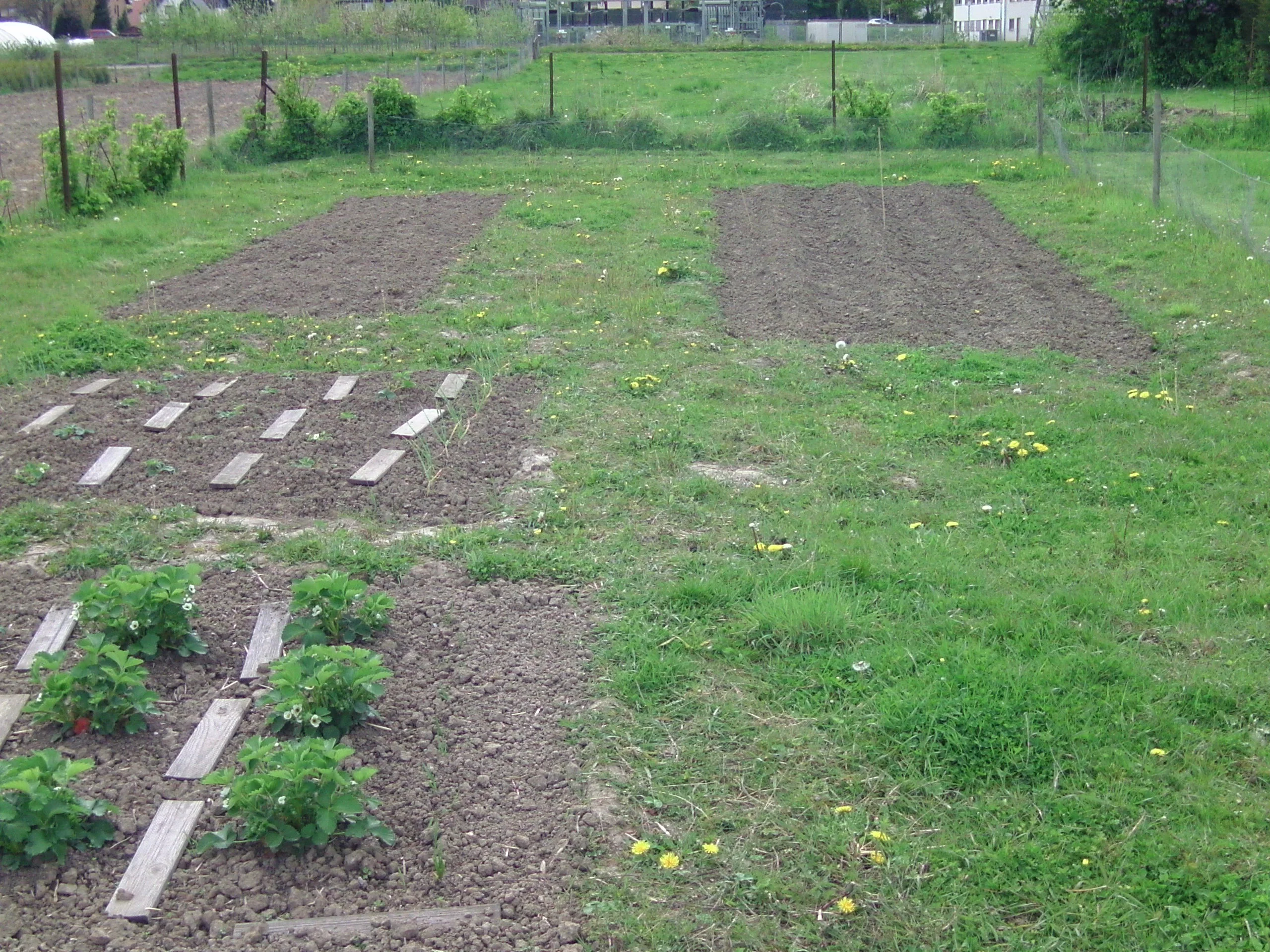 Sehr viele Disteln wachsen da und anderes Kraut. Dort haben wir gleich im Januar angefangen zu mähen, und auf einem Teil der Fläche ein Beet vorzubereiten, circa 20x20m. Mehrmals umgegraben, teilweise Kompost eingebracht, und viel Unkraut gezupft. Der Boden war sehr schwer und auch etwas lehmig, kurzum betonhart - das war viel Arbeit. Mittlerweile wachsen dort schon Kartoffeln, Bohnen, Erbsen, einige Kohlsorten, Gurken, Erdbeeren, Tomaten und Zwiebeln.