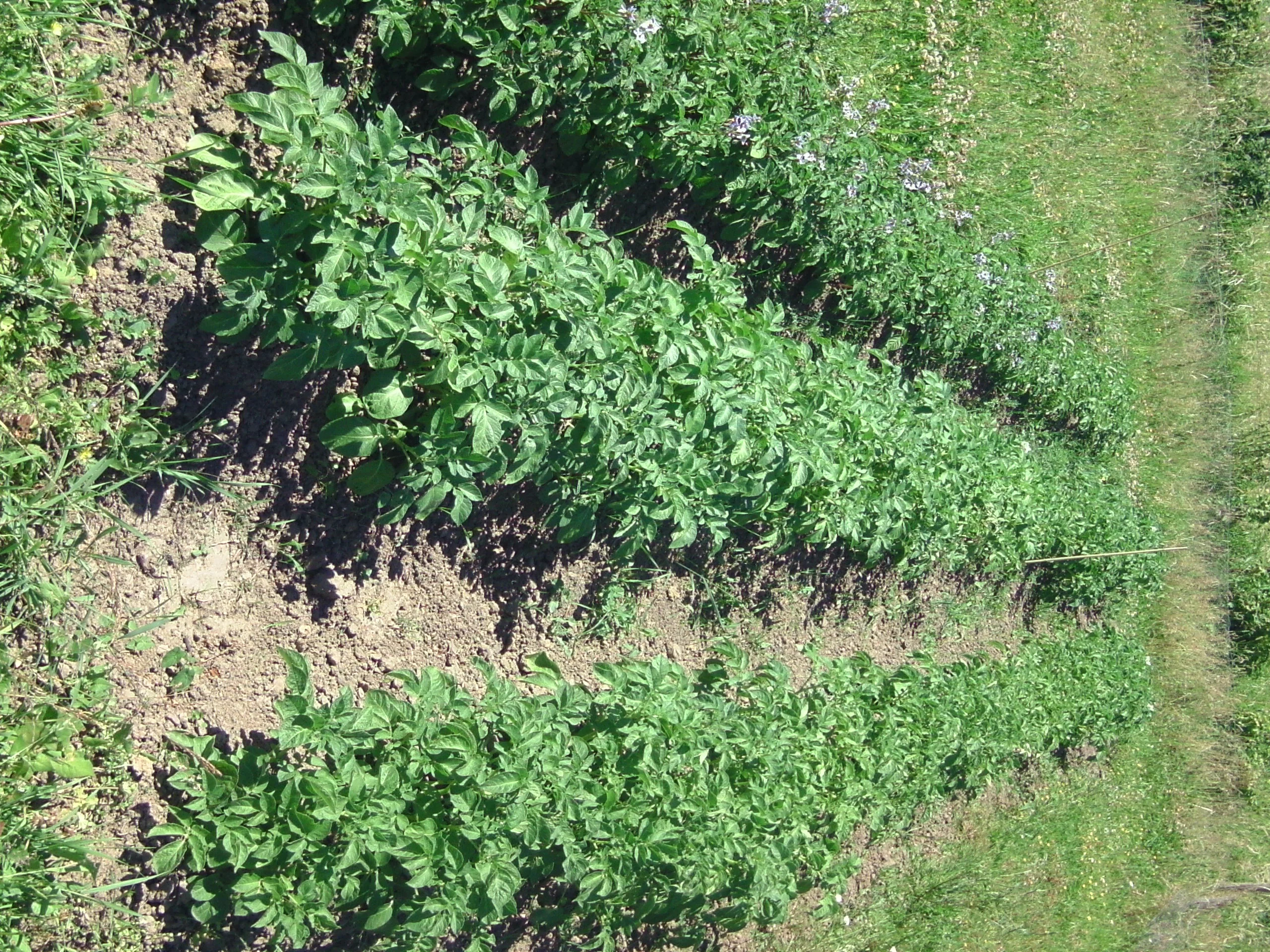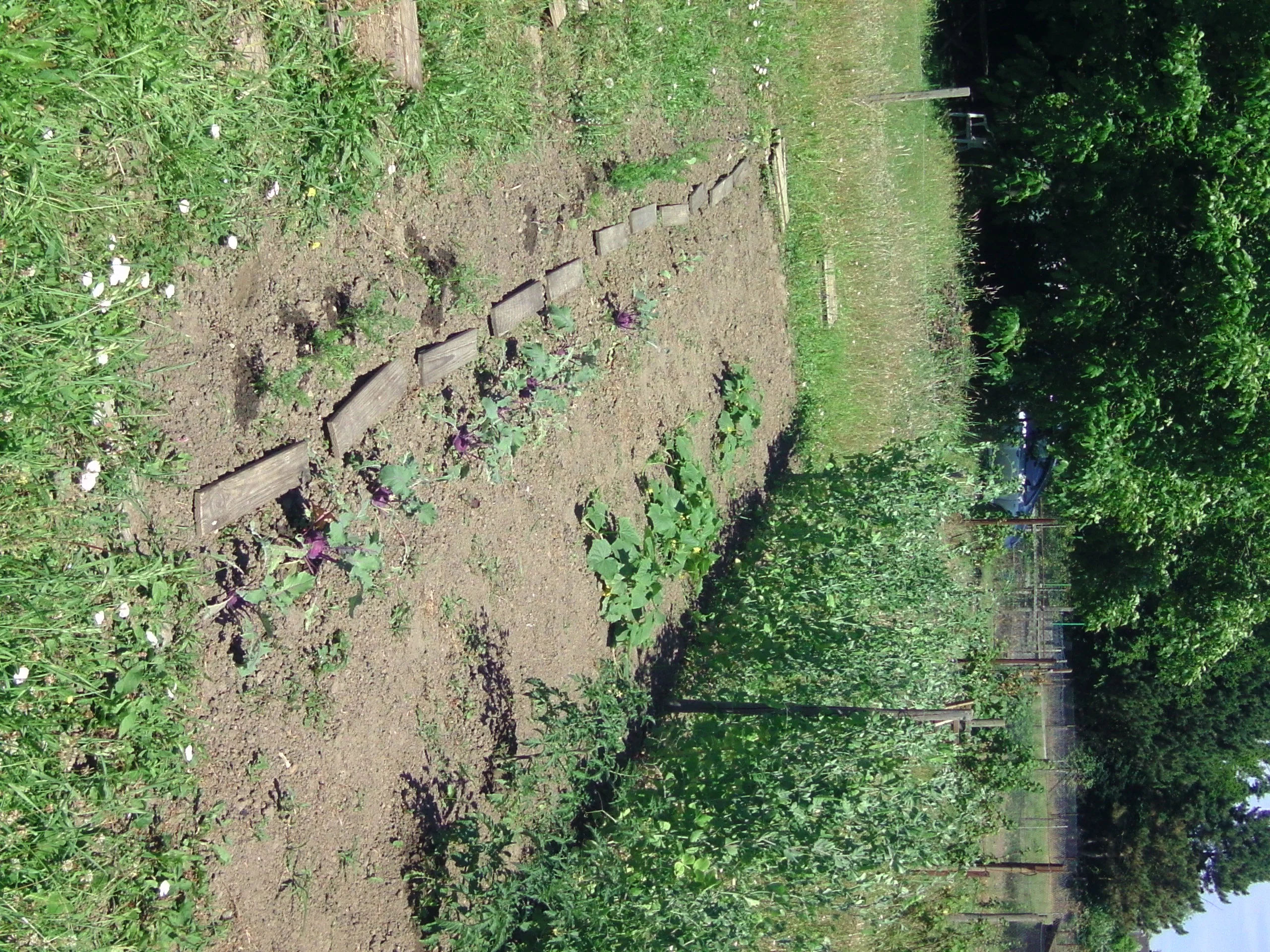 Unser Acker. Im Bild Kartoffeln, Zucchini, Gurken, Kohlrabi, Bohnen und viel Unkraut. Weiter hinten ein paar Erdbeeren und Johannisbeeren.