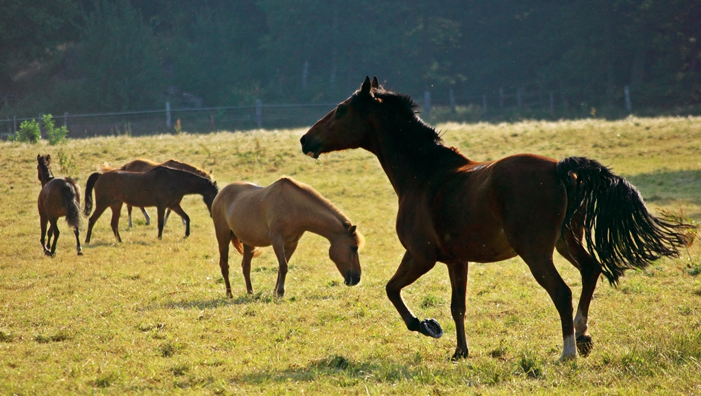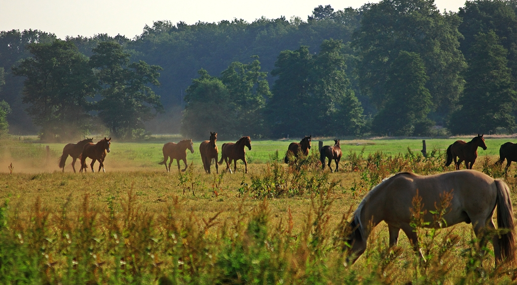 Heute früh habe ich mich auf die Lauer gelegt... und die Pferdeherde fotografiert, als sie auf die Weide gelassen wurden...