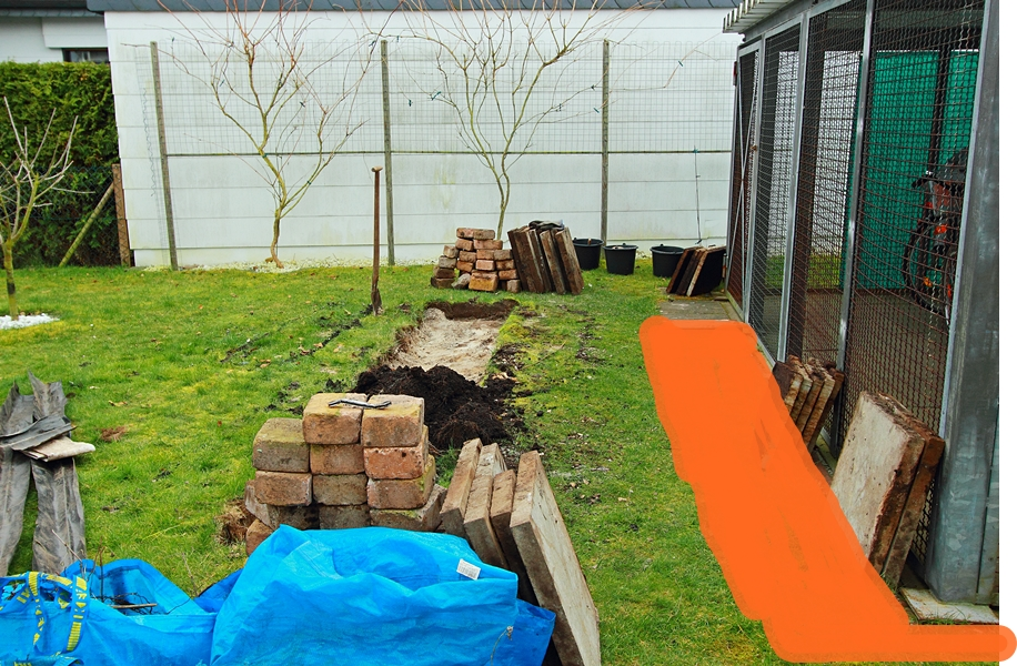 der orange gekennzeichnete Bereich am Hundezwinger wird ausgehoben,