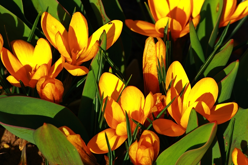 Verschiendenfarbige Krokusse blühen und haben ordentlich
