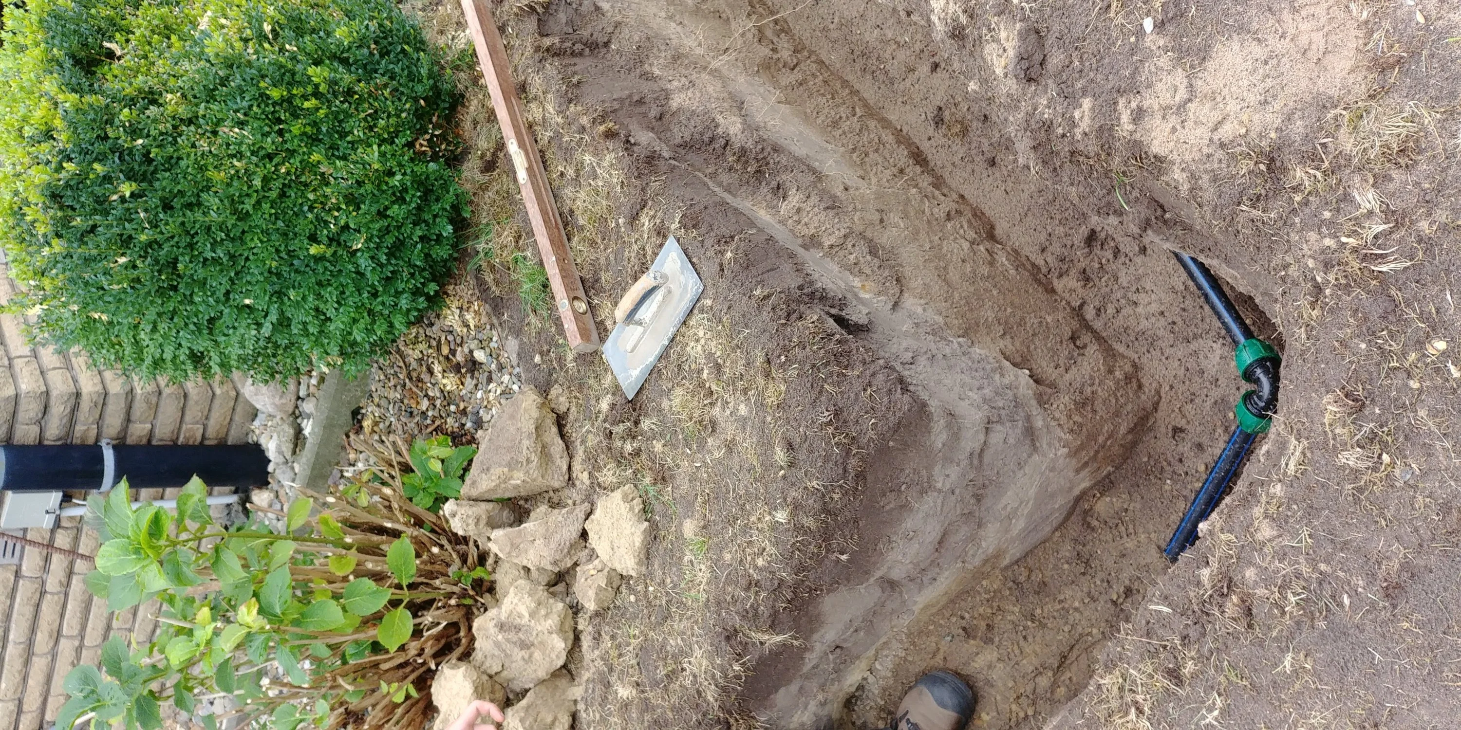 Heute wird das erste Mal gespült, dann haben wir auch wieder etwas Platz für mehr Aushub und die zwei temporären Strecken können danach über die dauerhaften (Beet um die Terrasse wird noch verkleinert, die 5t Pflanzringe sind aber zuviel für dieses Jahr, zeitlich gesehen).