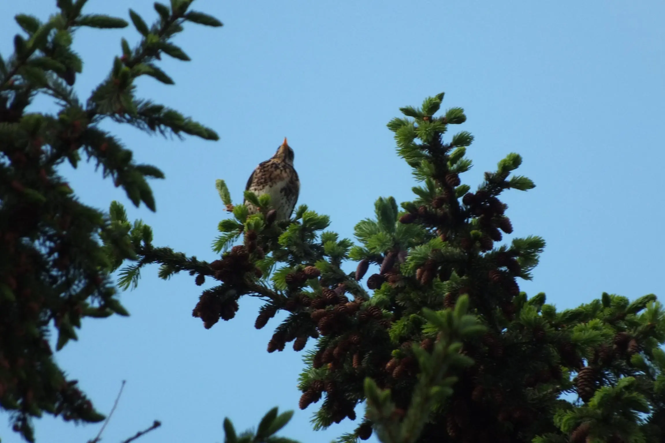 Waacholderdrossel hält Ausschau, Dompfaffdame beim Baden