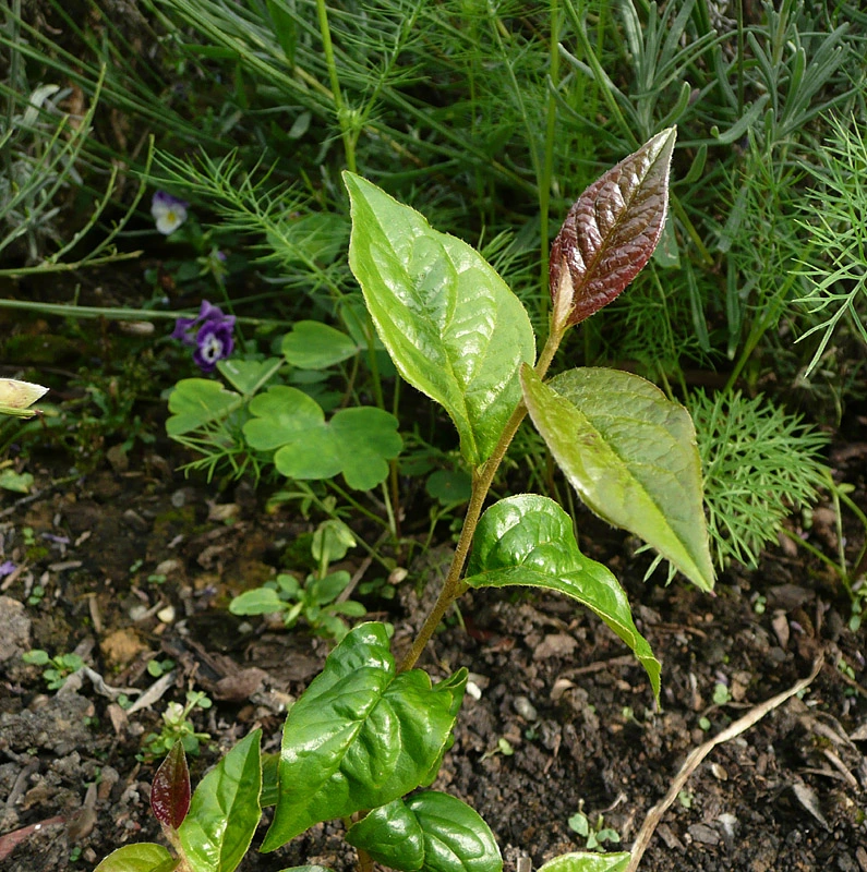 Zu Anfang sind die Blätter rundlich, wie die obere hälfte einer Herzform. Dannn kommen die spitzen Blätter.
