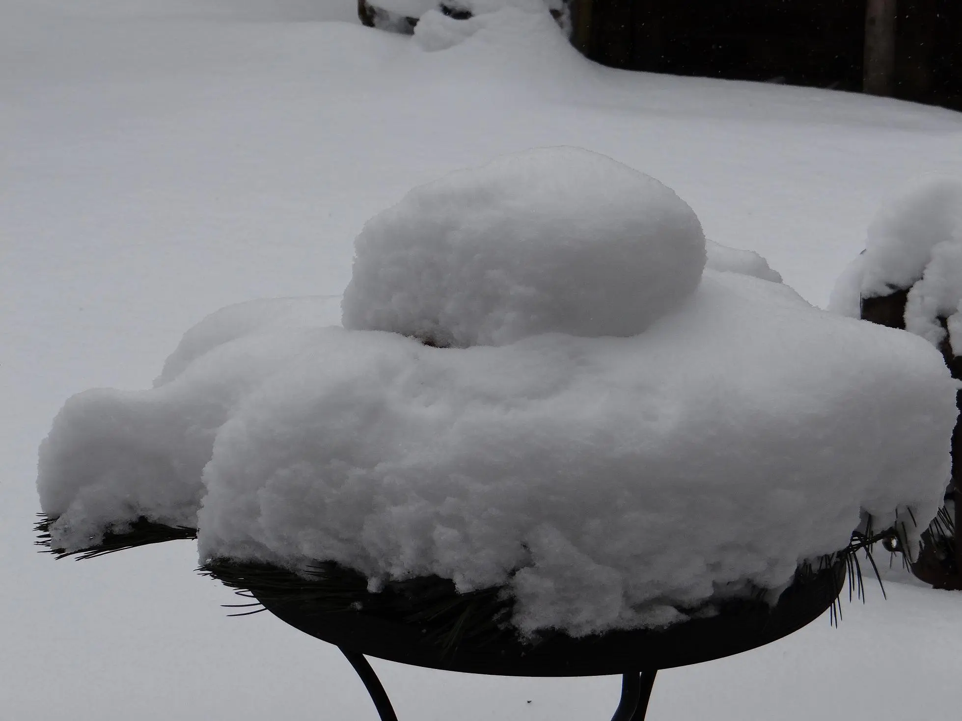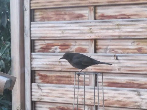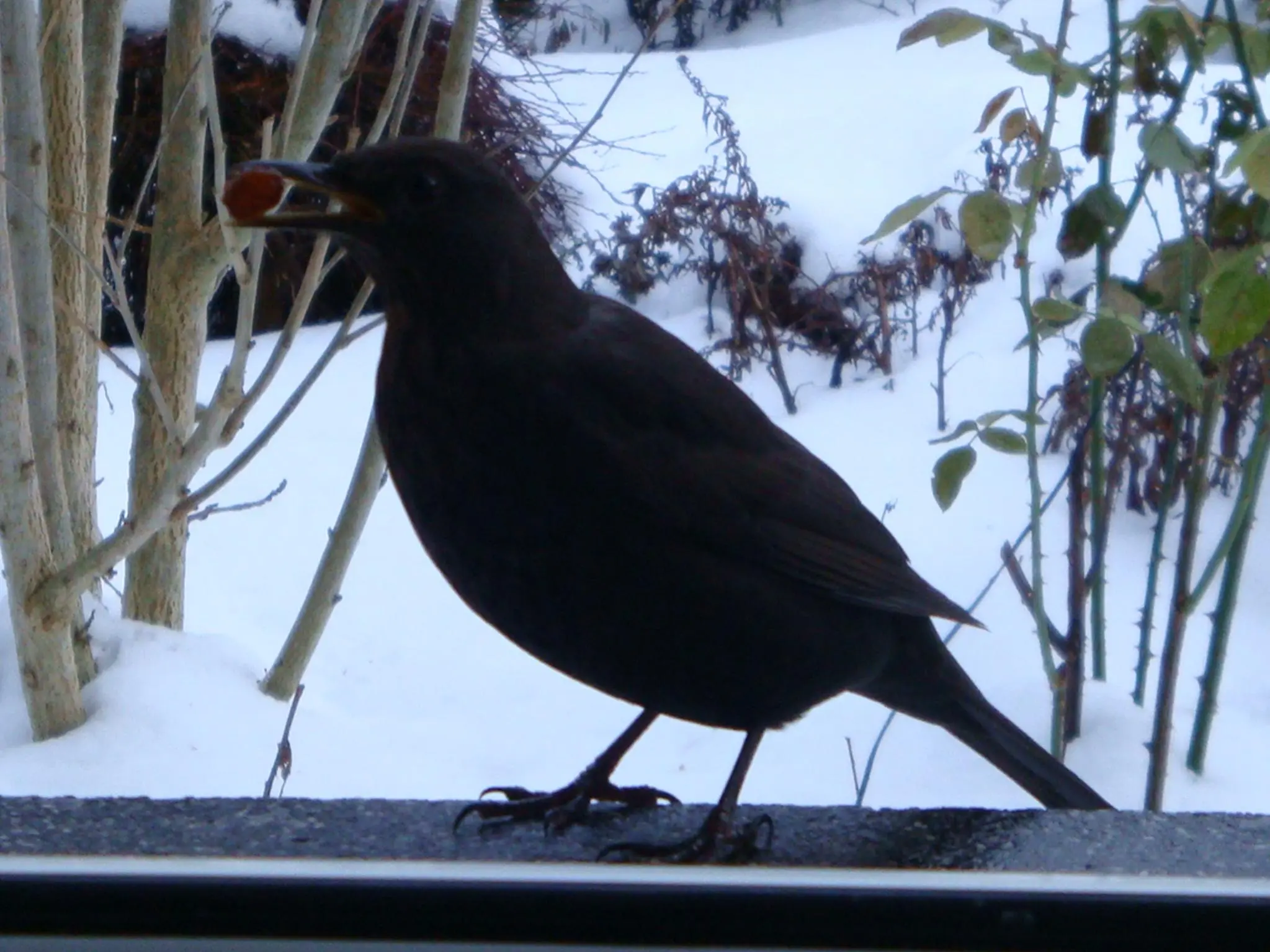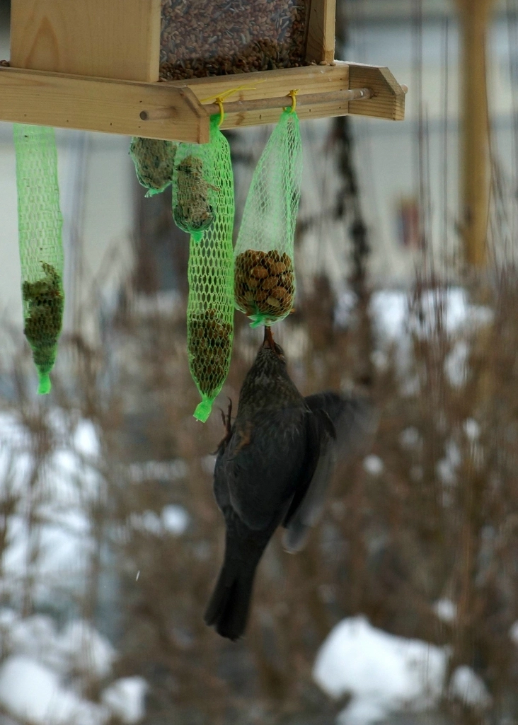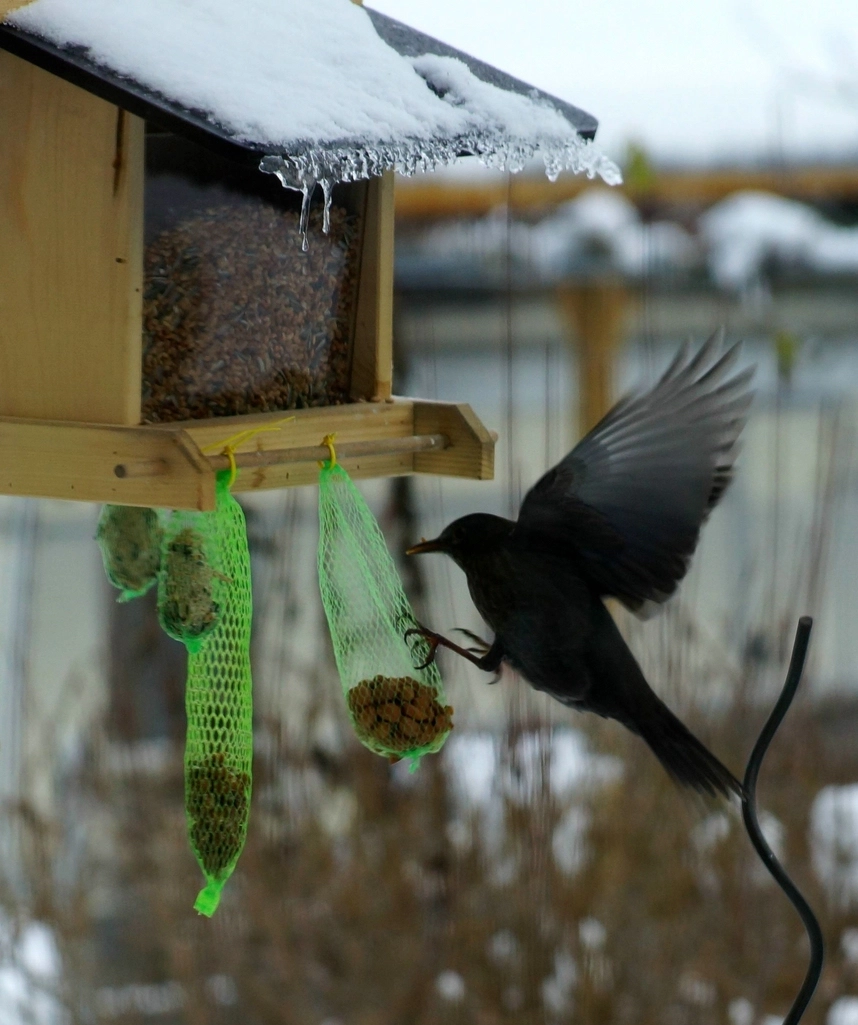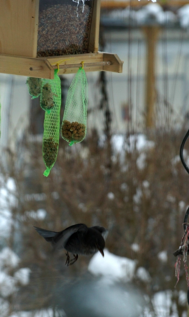hier ist vor den amseln nichts sicher. die quetschen sich ins kleinste vogelhäuschen.