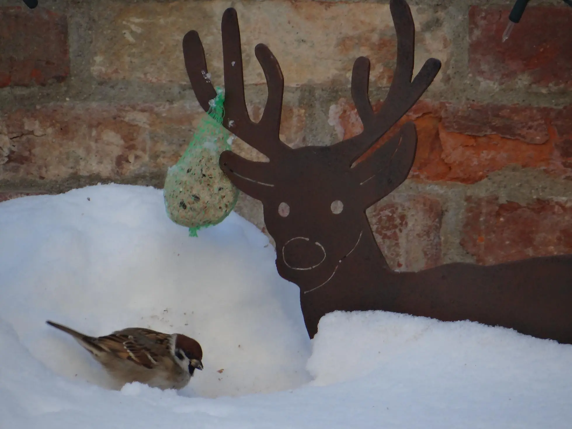 Kleines Futterhäuschen hoch gehängt für die kleinen, da kommt keine Amsel rein und 1 Schüssel auf dem Boden, 1 Futterhäuschen mittelgroß und dann noch mein abgestorbener Apfelbaum mit Meisenknödel behängt und drunter Mischfutter.