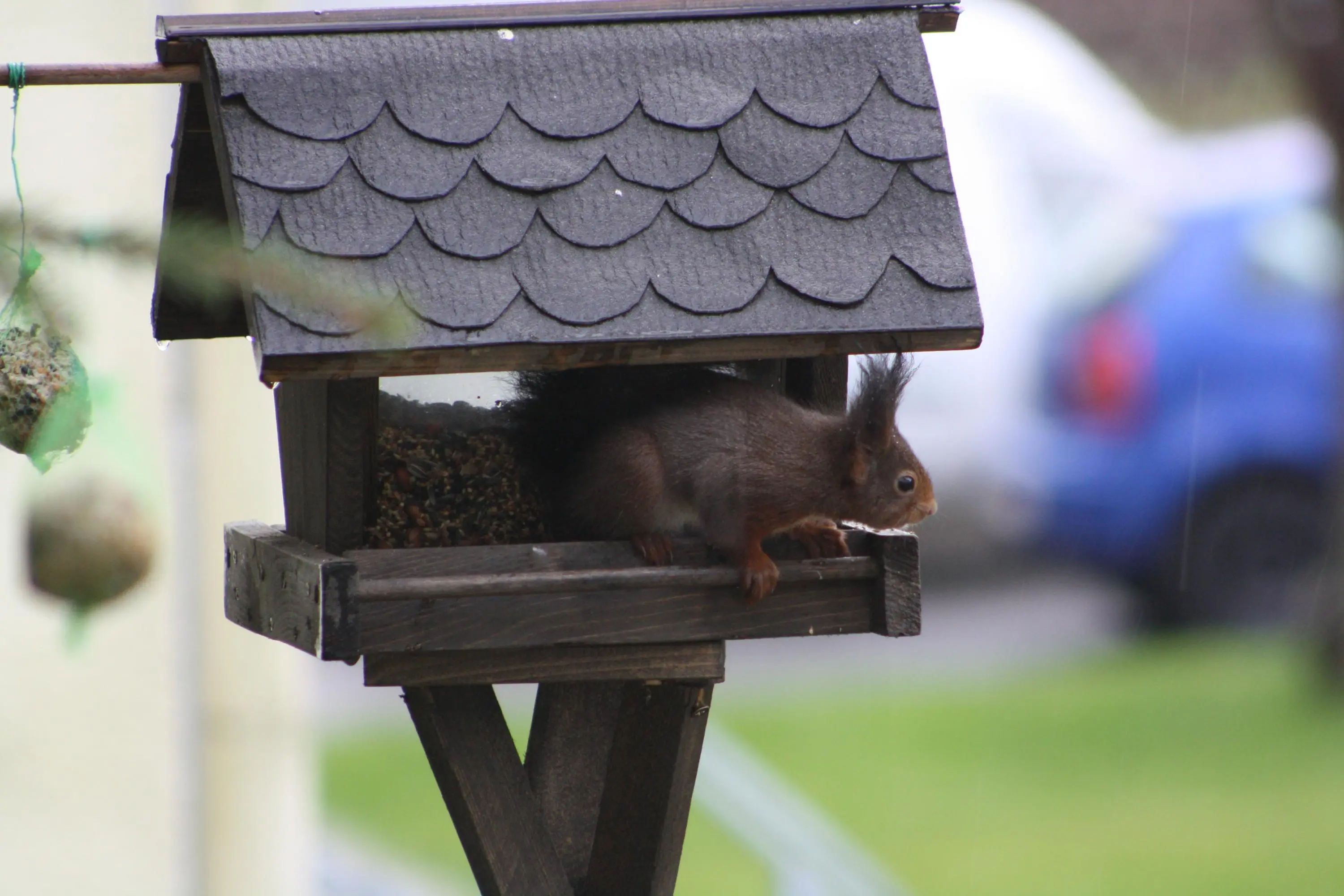Hab heute zwei weitere Silos aufgehängt, da ans Häuschen immer öfter auch Tauben, Elstern, Eichelhäher kommen. Die Futterstelle auf dem Terrassentisch hat das Rotkehlchen für sich beansprucht, neben den Blau- und Haubenmeisen.