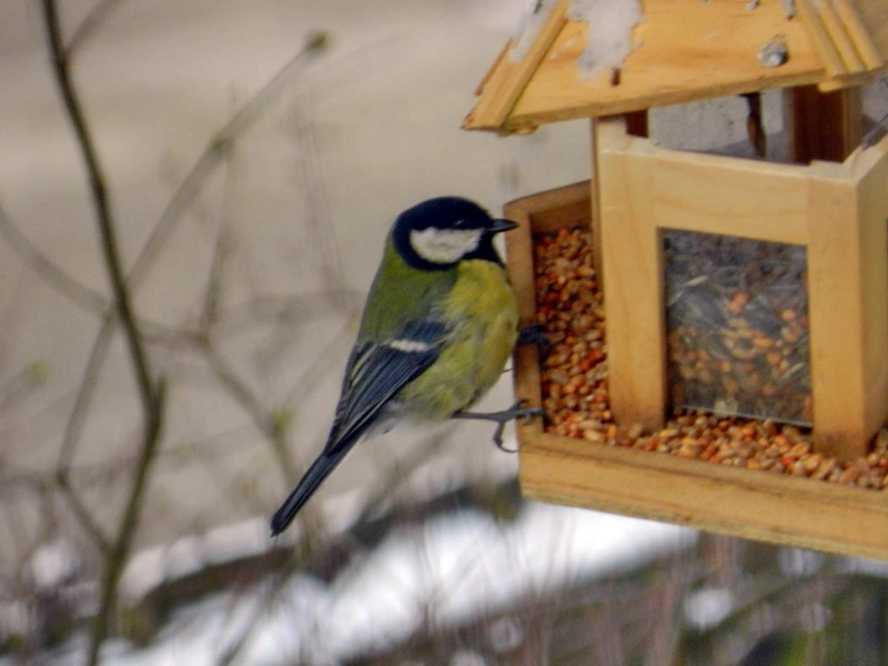 Mir ist dann des Öfteren beim Futter nachfüllen aufgefallen, daß bei dem kleinen Futterhäuschen das Dach, das man zum Einfüllen hoch nehmen kann, ganz windschief obenauf hing. Sowie bei den Bildern unten mit der Kohlmeise.