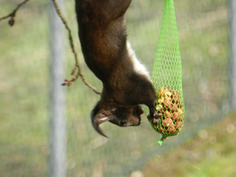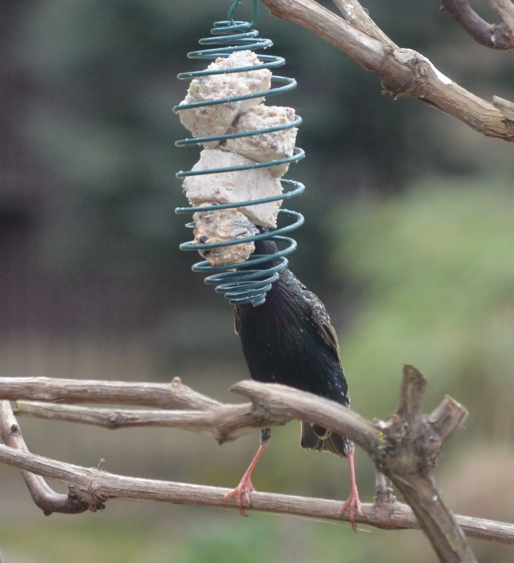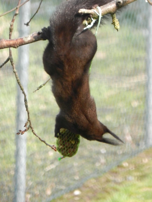 Ich hab in leere Körnersäckchen Hasel- und Walnußkerne eingefüllt und sie aufgehängt. Darauf sind sie ganz versessen. Sie stellen die unmöglichsten Verrenkungen an, um an die Nüsse zu kommen.