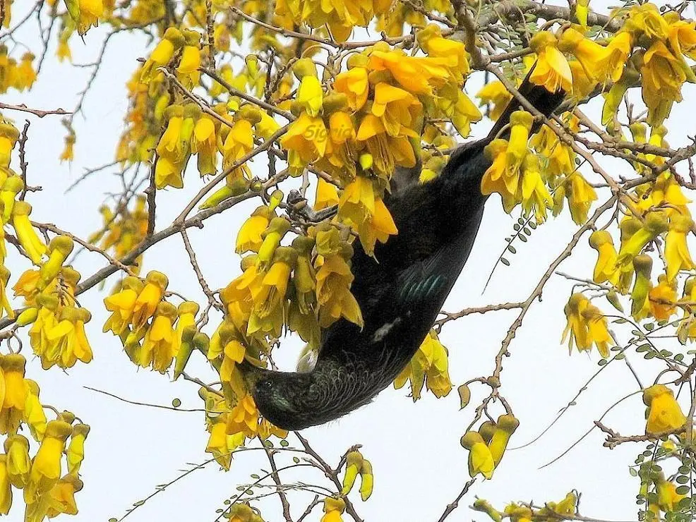Habt ihr unsere Tuis schon gesehen?? im Fruehling bevoelkern sie den Kowhai Baum im Garten! Kia ora