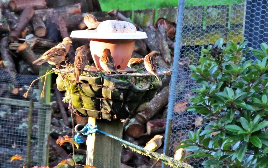 • Unsere Mensa ist jetzt ziemlich gut besucht! Es dauerte eine Weile, bis die Voegel sie akzeptierten, aber nun ist dort reges Treiben. Allerdings nur von Spatzen, die lassen wohl keine anderen ran.