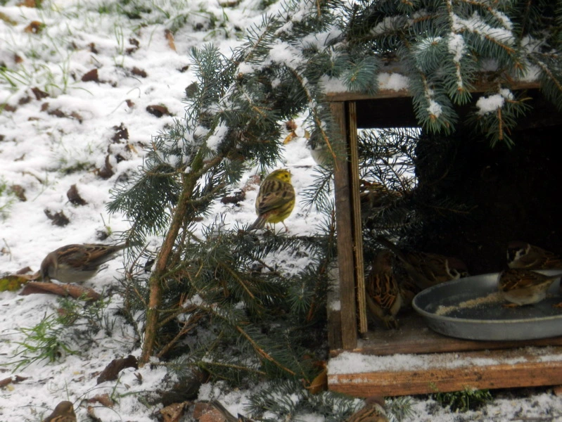 Zum Glück sind die fiesen Elstern bisher nicht aufgetaucht. Aber gestern versuchte sich ein Eichelhäher ins Vogelhaus zu zwängen, sah sehr lustig aus, aber wieder keine Kamera griffbereit!![]()