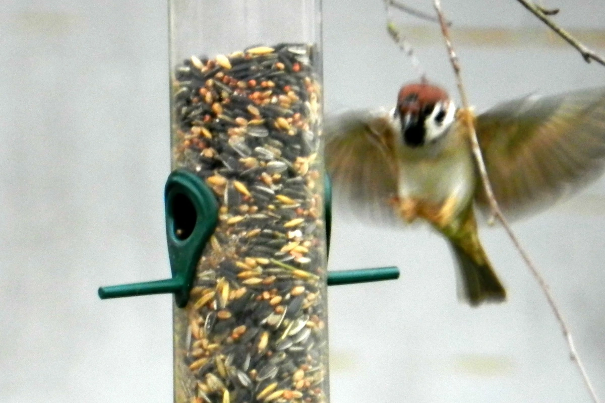 Dann kam ein Spatz, stocherte darin so lange herum, bis er alle rausgeschmissen hatte. Dann kamen noch mehr Spatzen .. ..