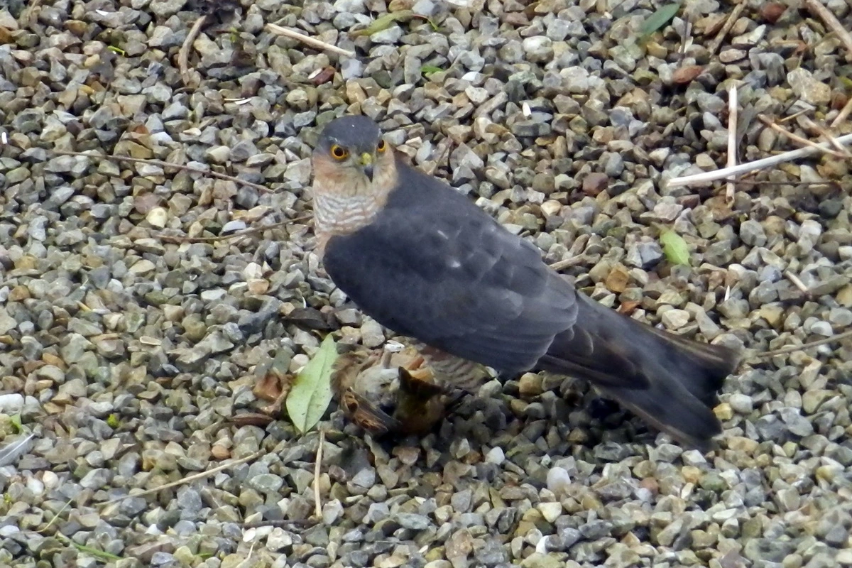 Da wurde ich plötzlich durch einen lauten, entsetzlichen Vogelschrei aus meinen Beobachtungen gerissen und mußte mit ansehen, wie ein Sperber genau vor meinem Küchenfenster einen kleinen Spatzen riß.