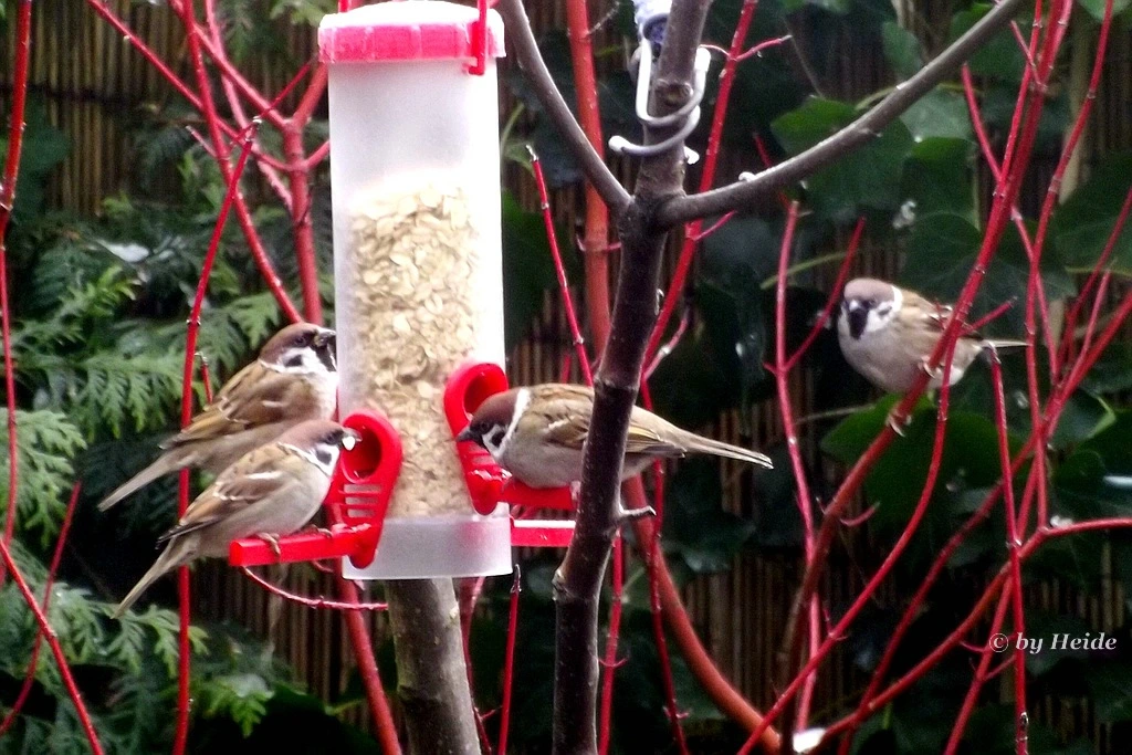 Aber ich kann ohne zu übertreiben sagen, daß es manchmal 30 und mehr Spatzen sind,die hier im und ums Futterhäuschen rumwuseln.