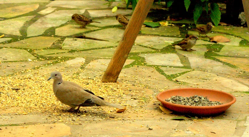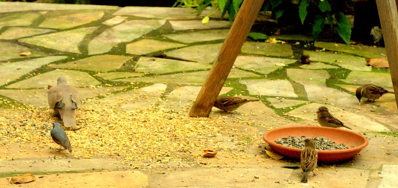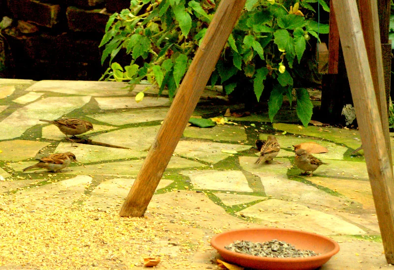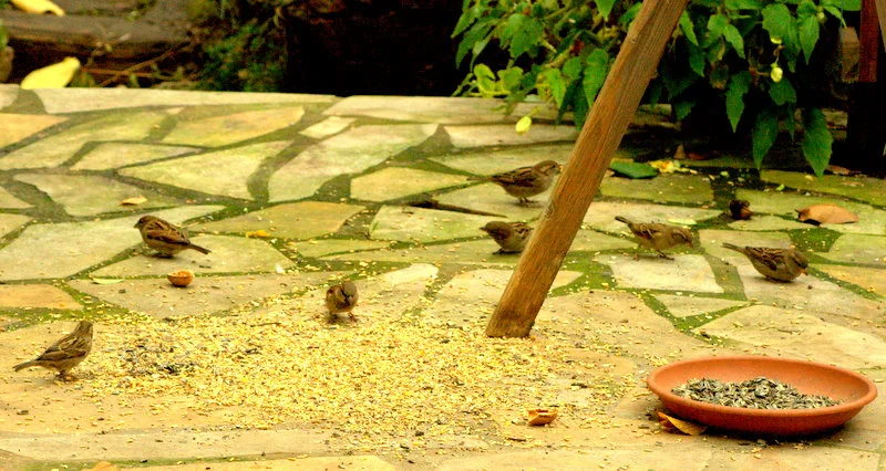 Heute hab ich das Futterhaus gereinigt und alles was noch drinnen war auf die Terrasse geschüttet, Nachschub gibt es erst morgen, die Spatzen sollen zuerst das Getreide auffressen.