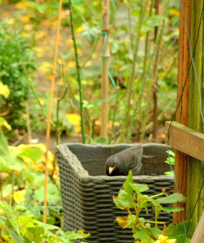die Amsel findet das Futter im Blumentopf interessanter,