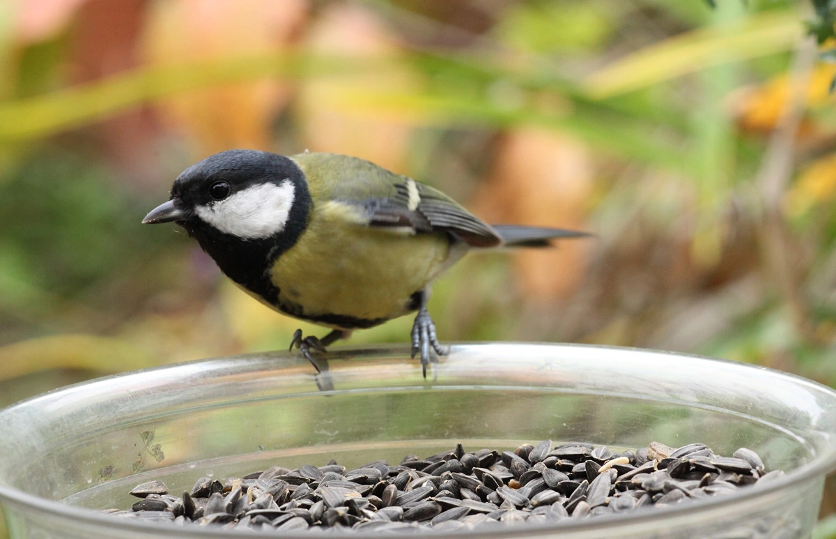 Die Dominanz der Kohlmeisen ist schon erdrückend. Ab und zu schafft es eine Blaumeise ein Sonnenblumenkörnchen zu schnappen, die Spatzen sind gleich wieder weggeflogen, Buch- und Grünfink bedienen sich noch an Samen abgeblühter Pflanzen.