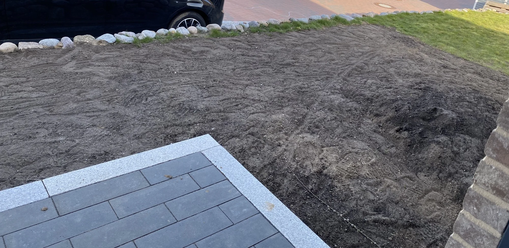 Ich hatte gedacht, man könnte quasi die Verlängerung des Eingangspodestes und dann um die Ecke rum die Breite zwischen dem Weg und dieser hässlichen Insel mit dem Baum aufnehmen und dort bepflanzen. Meine Idee wäre quasi an der Ecke ein Pampasgras, aber ich bin mir nicht sicher wegen des Standorts, da es ja sehr viel Sonne braucht, oder? Es ist die Nordseite, aber die Sonne scheint quasi die Hälfte bis ein Drittel des Tages nicht ganz übers Dach drüber, dass es nicht voll in der Sonne stünde. Daneben dachte ich die Wege lang vielleicht kleinere Gräser und eventuell Lavendel? Kann mir aber nicht recht vorstellen, ob das zusammen passt. Den Rest erstmal Rasen. Würdet ihr an dieser Insel längs etwas pflanzen? Wir wollten oben auf der Mauer lang eigentlich unsere gemischte Hecke fortführen, damit die Leute und auch wir nicht mehr immer über die vorne noch flache Mauer drüberspringen, um zur Haustür zu kommen, sondern den Weg nehmen.