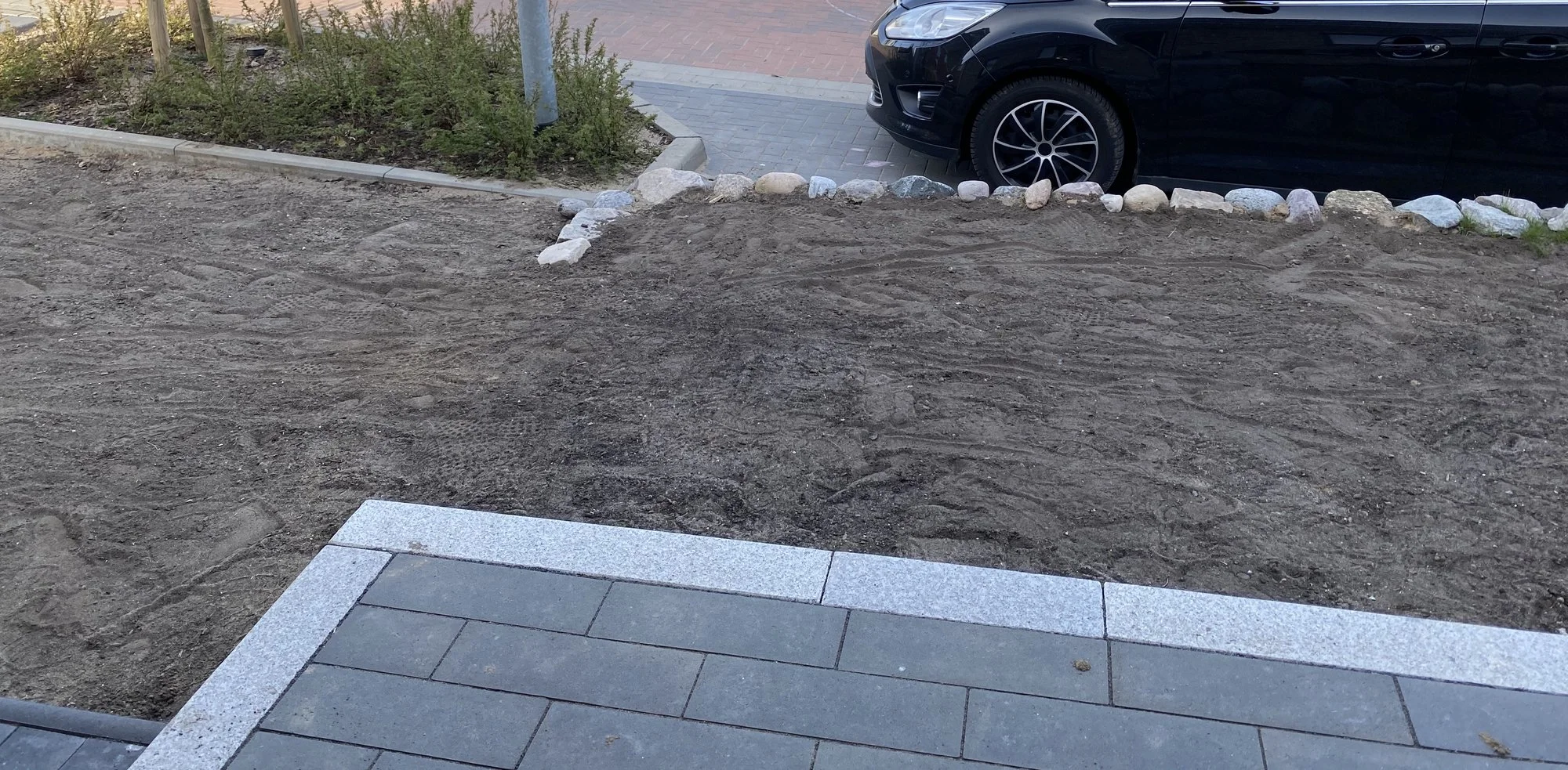 Hinter dem Weg kommt die Einfahrt mit Kies, vorne ist die Straße.