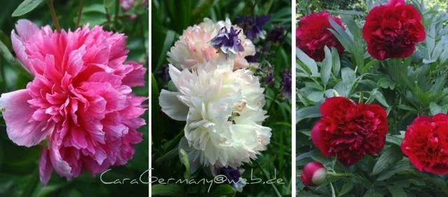 Die letzten der ersten Pfingstrosen blühen; weiß mit rosé Anflug, pink und kardinalrot. Die rote Bauernpfingstrose ist die älteste und hat 10 Stiele. 5 habe ich in die Vase gestellt.