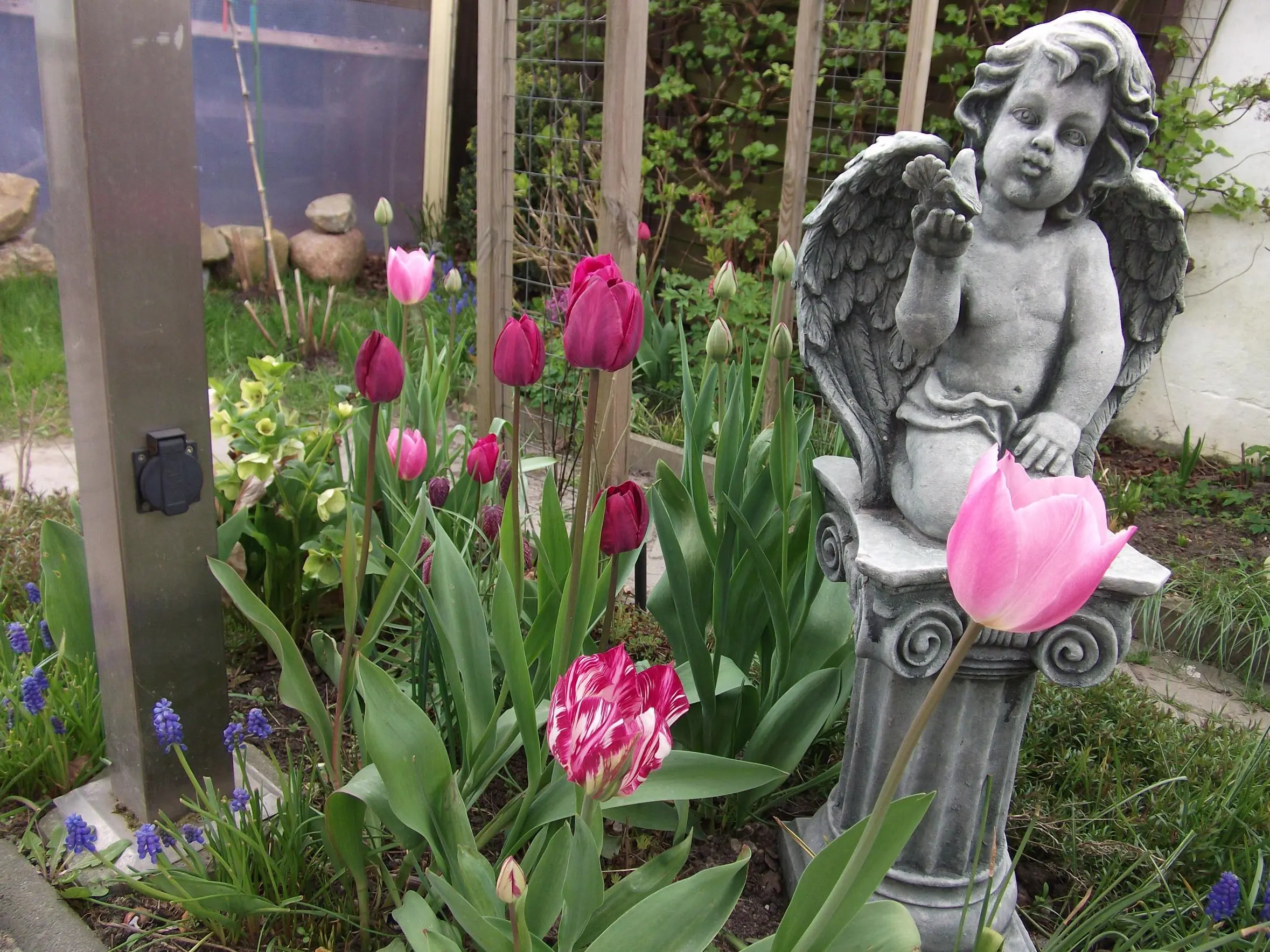 Tulpen zeigen Knospen. Die Zierjohannisbeeren zeigen schon Farbe.
