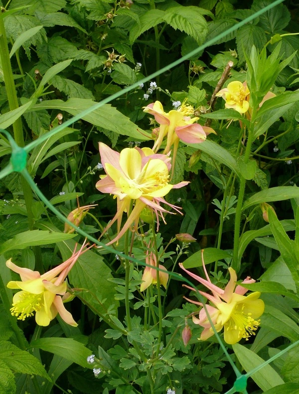Eine Akelei hat sich zwischen den Himbeeren versteckt