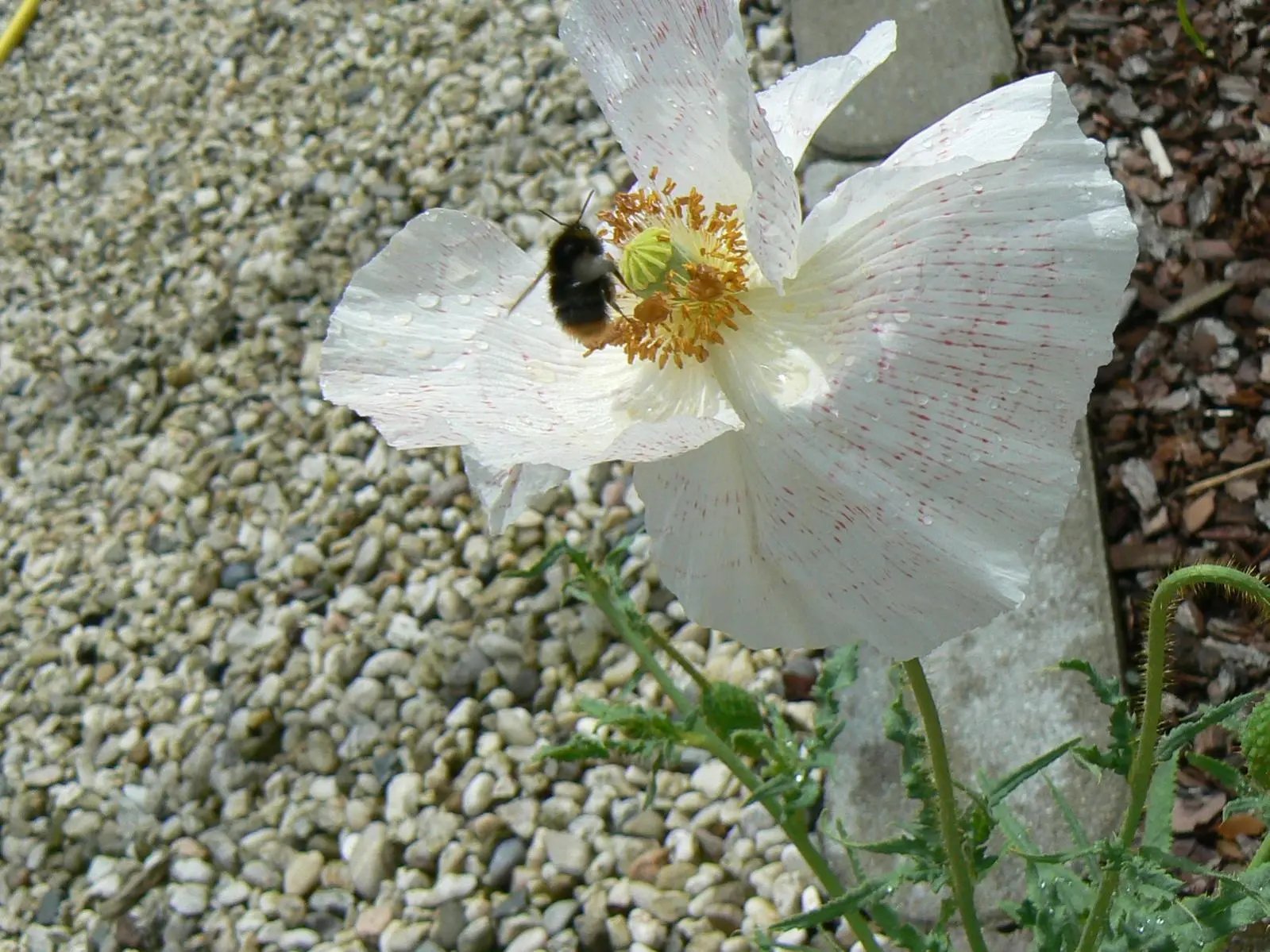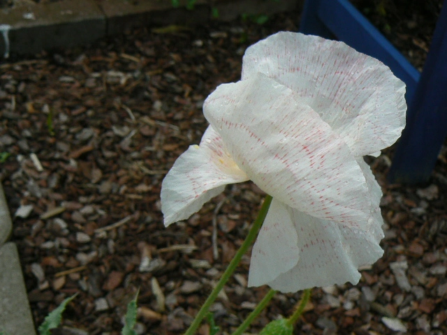 Mein Mohn hatte auch eine Überraschung für mich bereit, ein Exemplar kommt diesmal in weiß rum, mit einer sehr zarten roten Zeichnung. Die Eltern sind wahrscheinlich eher rot gewesen, hatten vielleicht eine kleine weiße Kante.