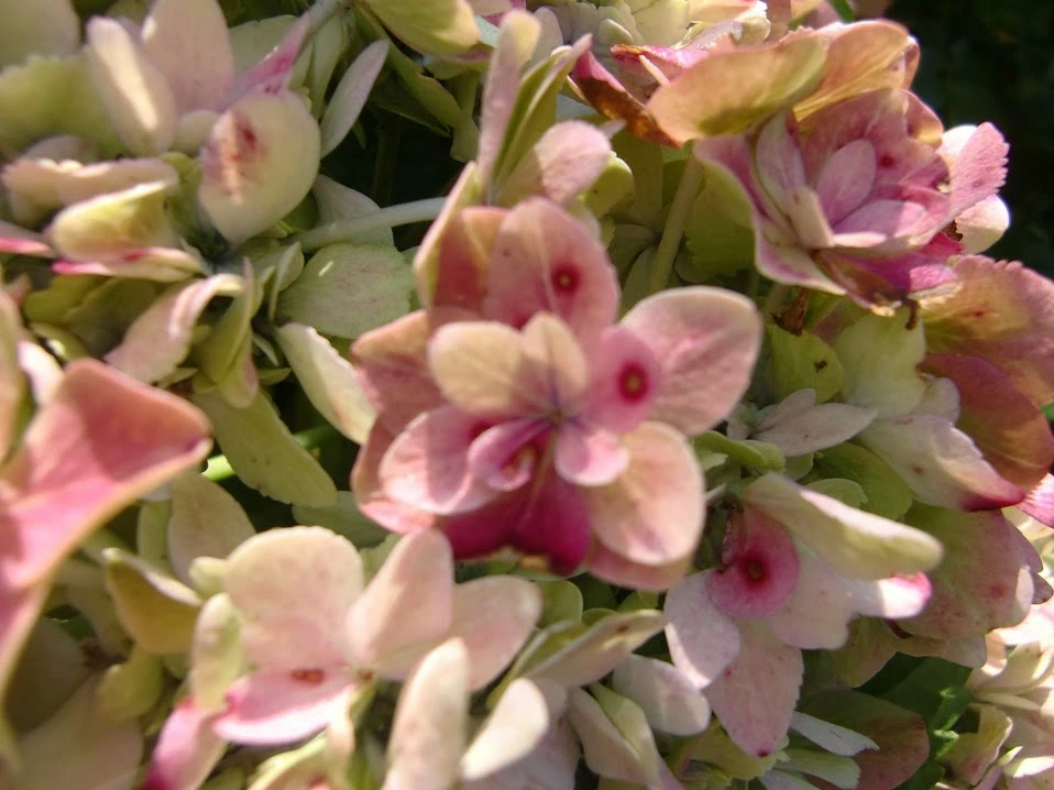 Blätter! Die Sonne kommt nicht mehr über die hohen Bäume. ich freu`mich an dem, was jetzt noch Blühen mag oder im Verblühen ebenso schön ist - wie die Hortensie.