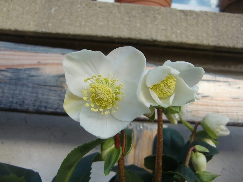Christrosen blühen natürlich auch, wie sich von selbst versteht. Leider sind die Blüten von Reinweiß (beim Kauf) ins Grünliche gekippt, seitdem sie in der Erde sind. Kann man das eigentlich irgendwie verhindern?