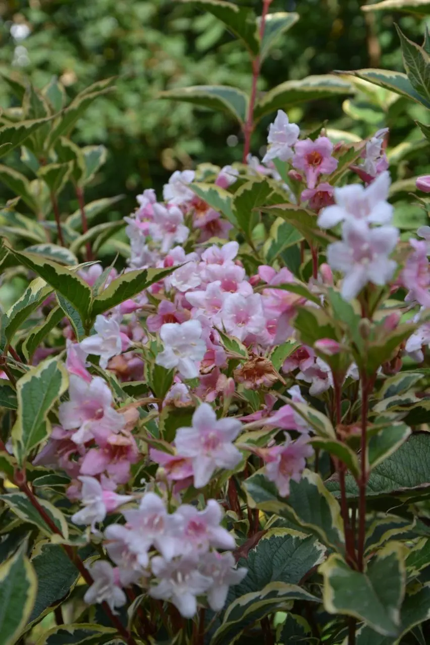Der Schneball *Viburnum* tinus stehr in voller Blüte, 8).