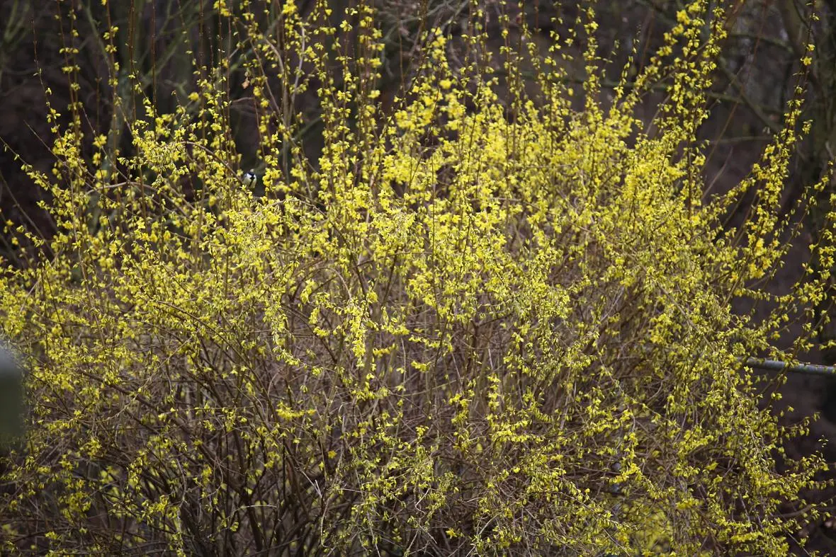 • Die Forsythie ist erblüht. Wer findet die Meise.