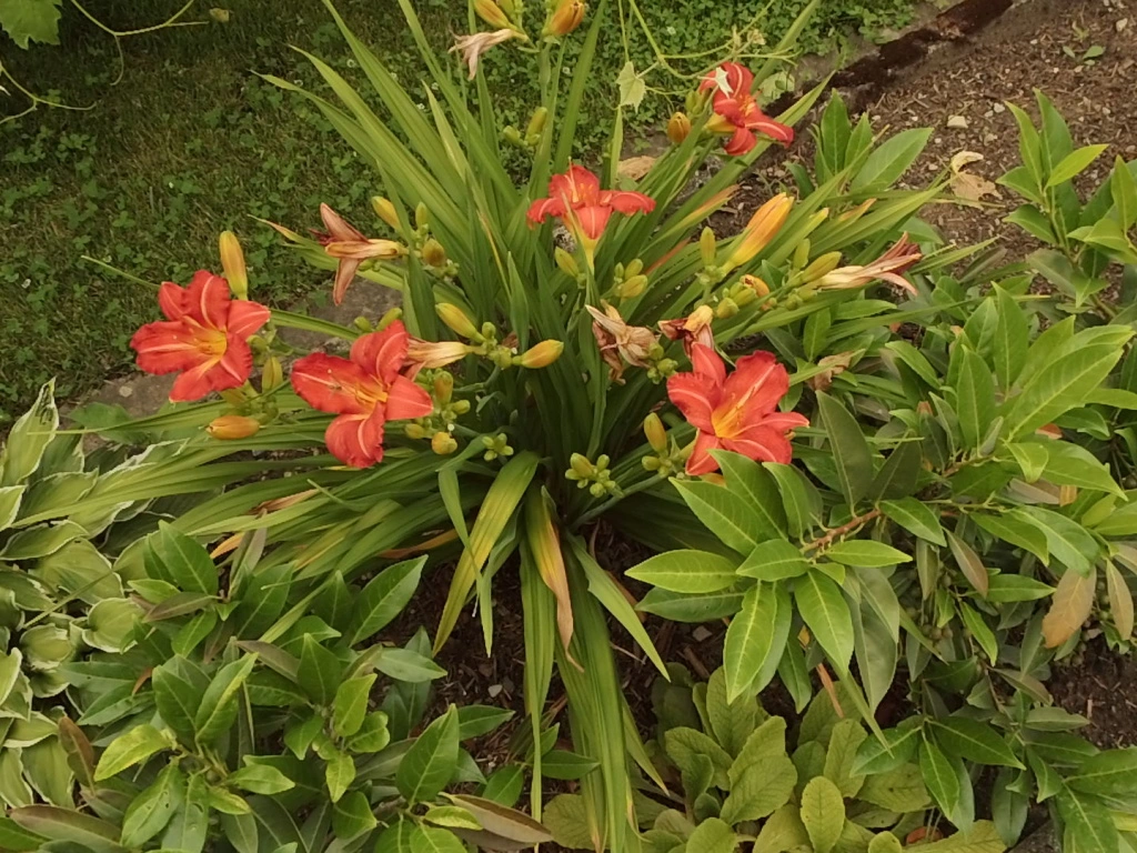 Mein alljährliches Fulva-Beet ... nicht meins, da ich es nicht gepflanzt habe, sondern schon vorfand; jedes Jahr will ich's ausreißen und durch aufregendere Taglilien ersetzen, aber jedes Jahr blüht das wieder lieb & zuverlässig, ich bring's nicht über's Herz ...