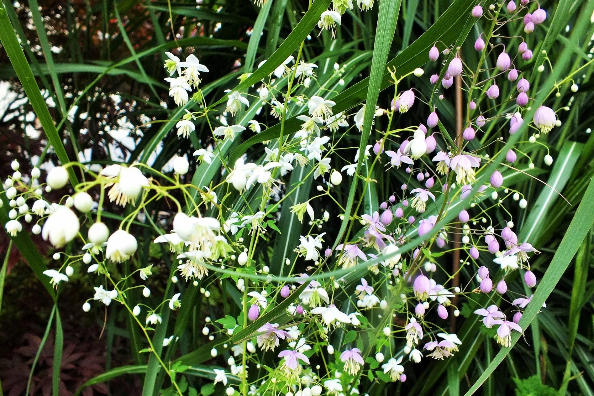 die Wiesenraute alba und fliederfarben in einer Staude.