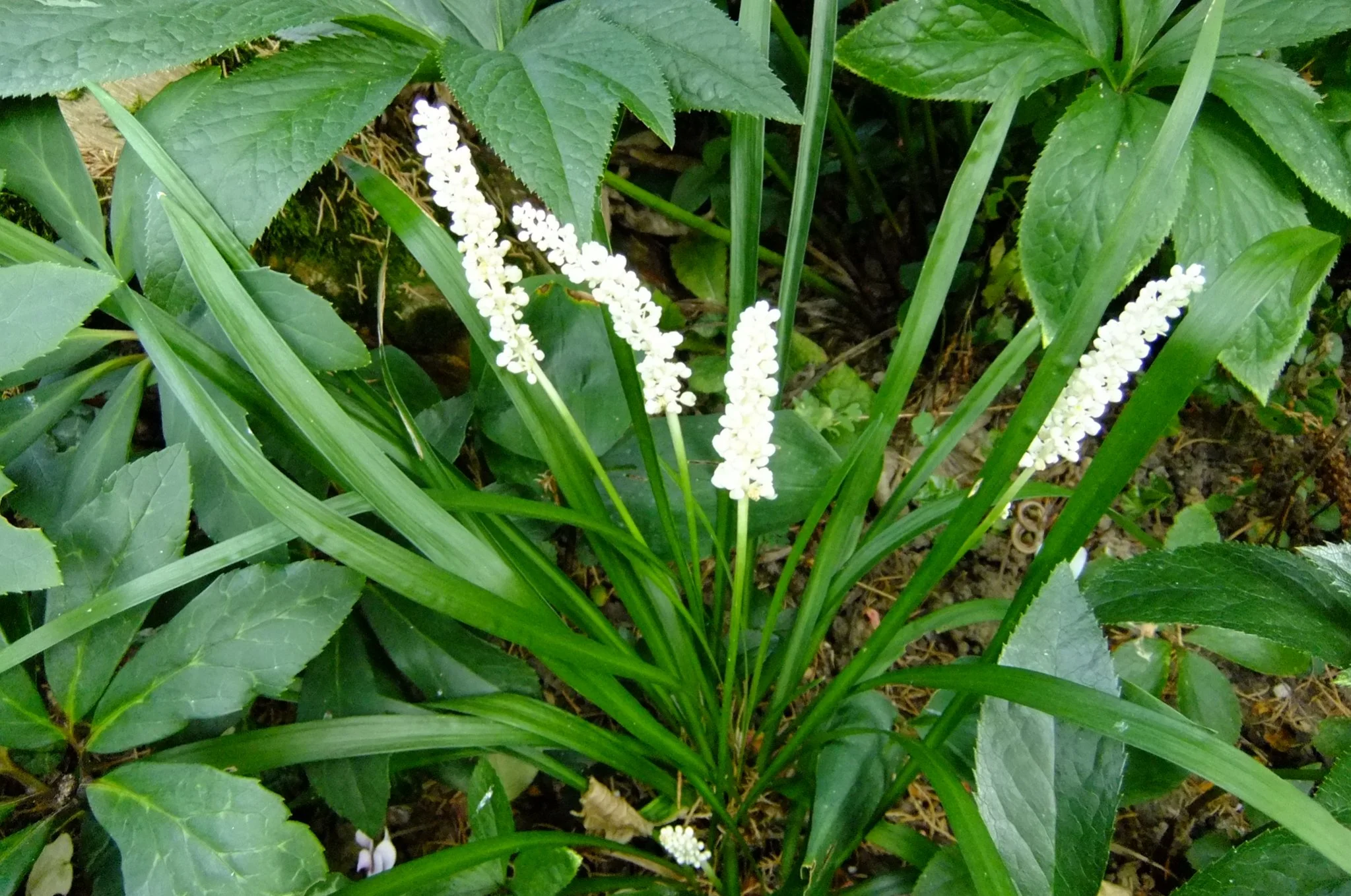 Für die ganz dunkle Ecke habe ich nach weißen Pflanzen gesucht und tatsächlich weiße Liriope gefunden.